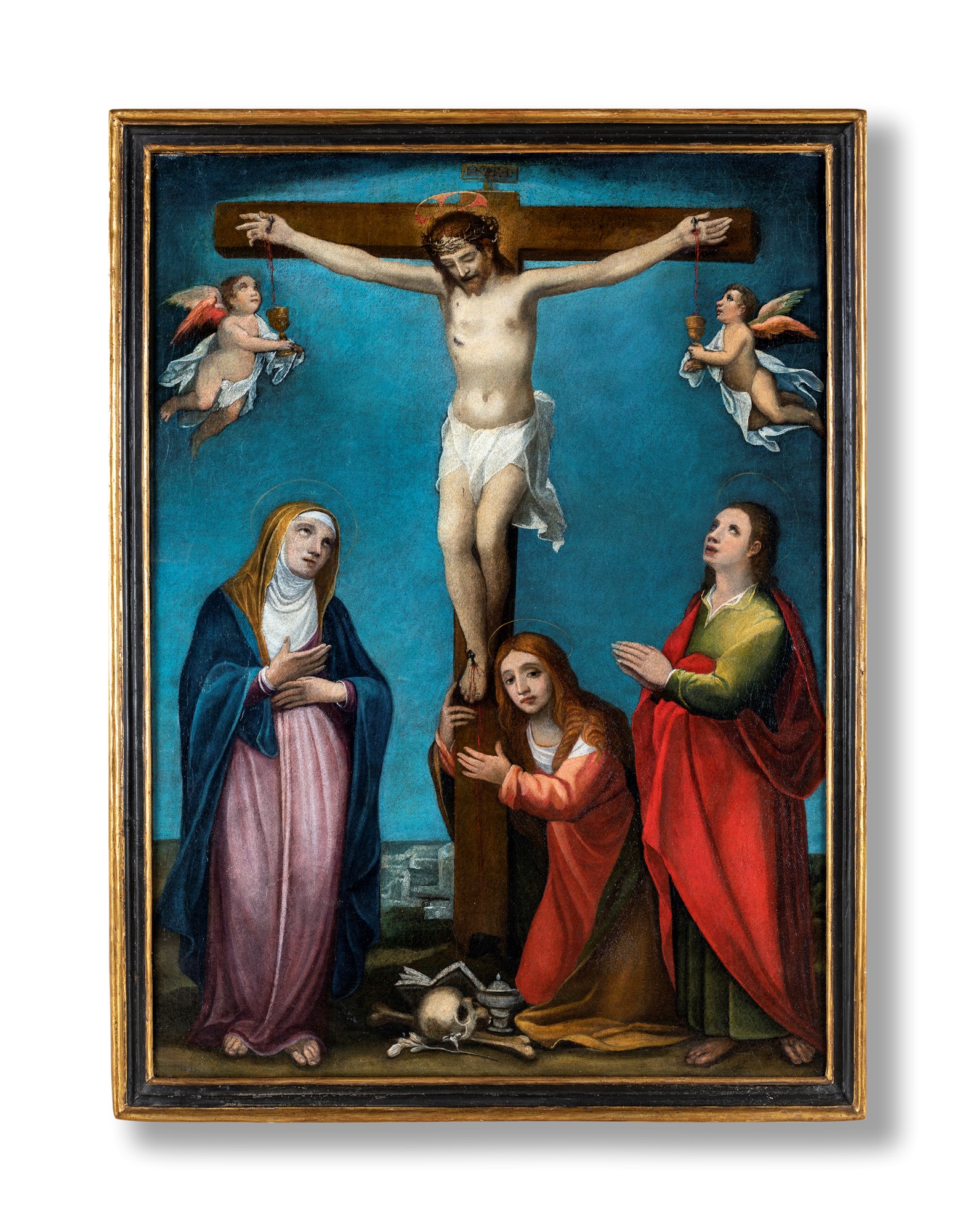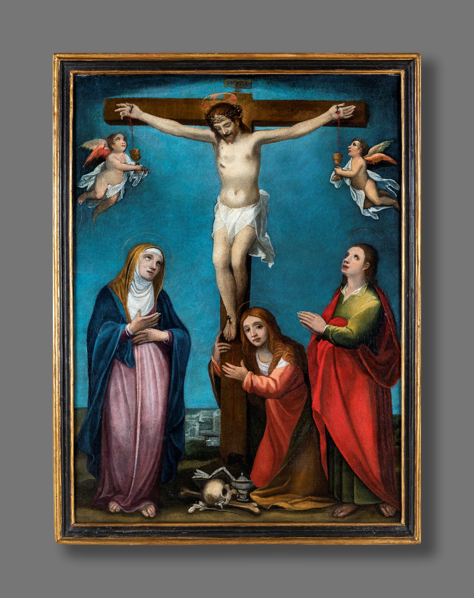 Alessandro Casolani Mensano 1552-Siena 1607 Crocifissione con la Vergine, San Giovanni e la Maddalena Ispirato alla tela di Scipione Pulzone in Santa Maria in Vallicella (Chiesa Nuova) a Roma. olio su tela cm 120x88