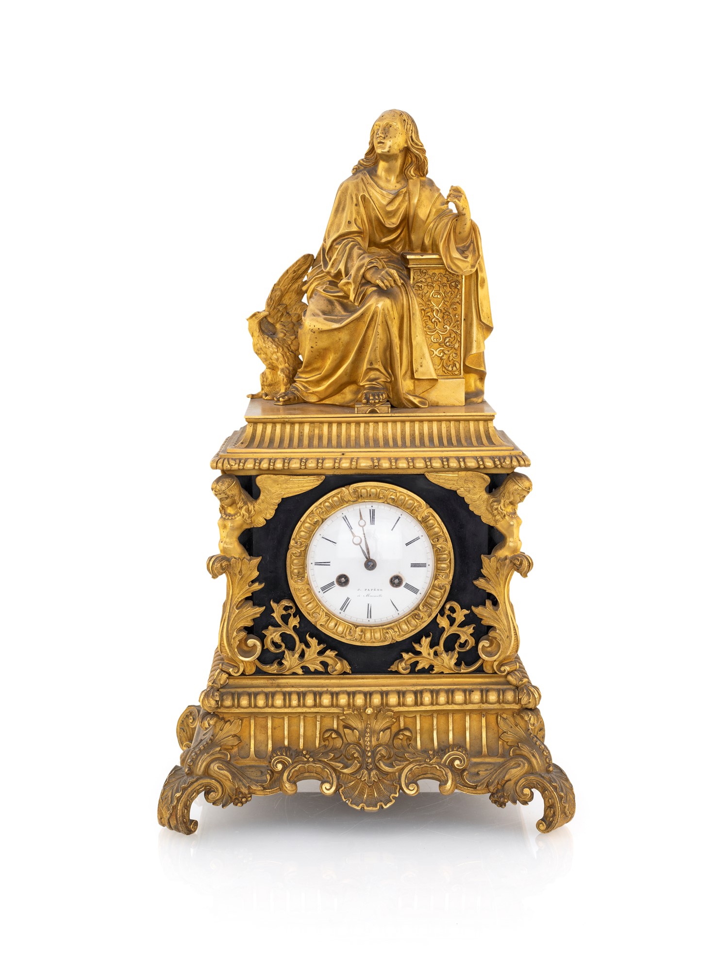 Orologio in bronzo dorato, Francia XIX secolo caratterizzato sulla sommità dalla figura di San Giovanni Evangelista. Cassa squadrata in marmo nero rifinita da figure di arpie angolari, quadrante circolare in smalto bianco a due fori di carica e fascia oraria a numeri romani, firmato Papère à Marseille. cm 55x32x18