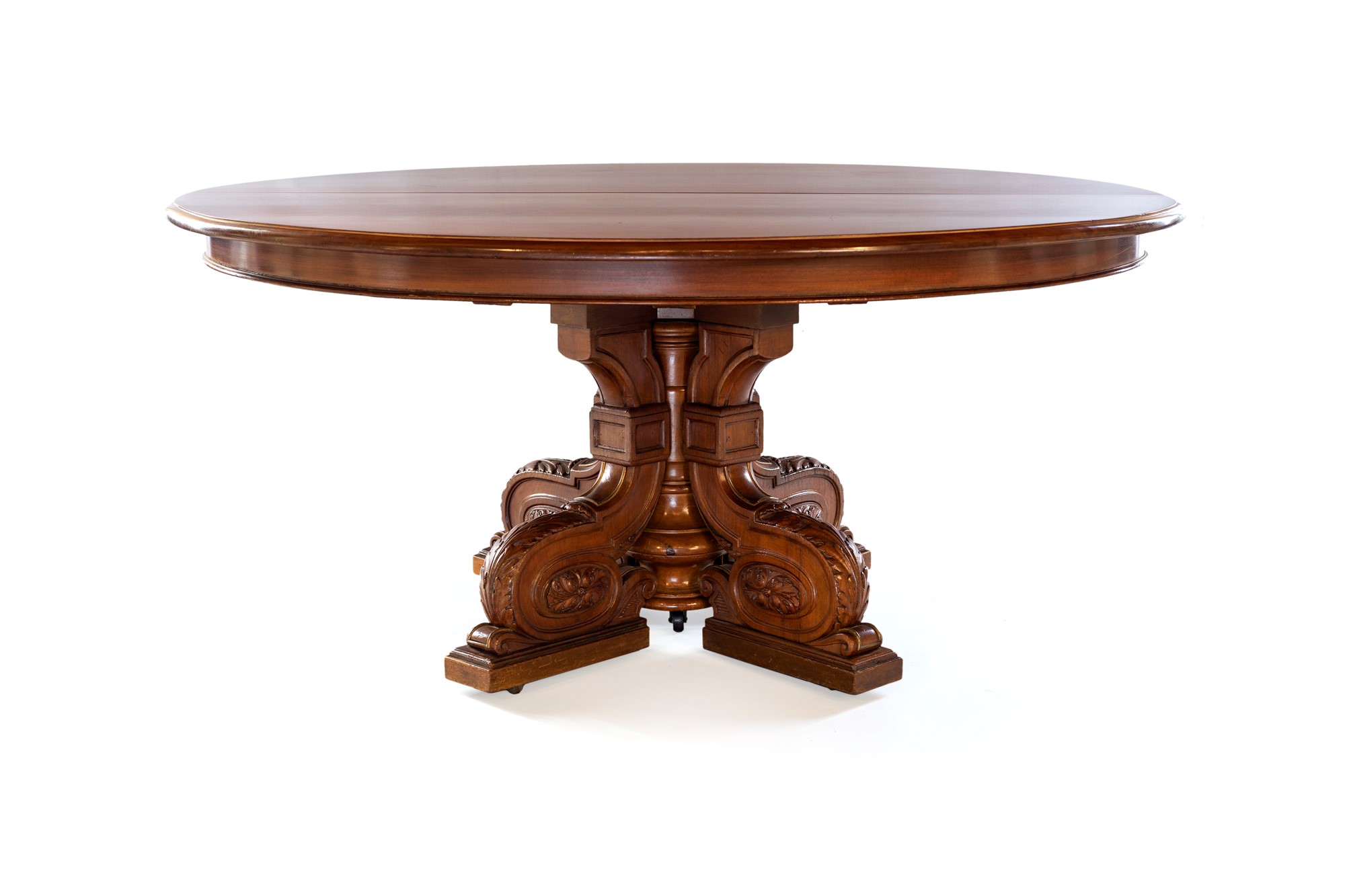 Tavolo in mogano, Francia XIX secolo con piano ovale allungabile, corredato di quattro prolunghe; sostegno costituito da quattro elementi in forma di mensola architettonica disposti a crociera e sottolineati da rilievi vegetali. cm 78x166x140 - ogni prolunga cm 64x140