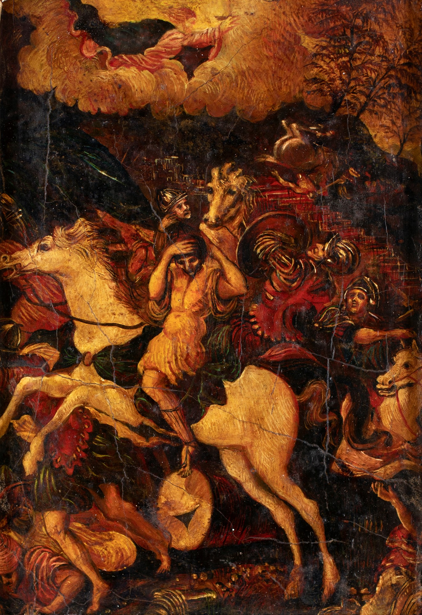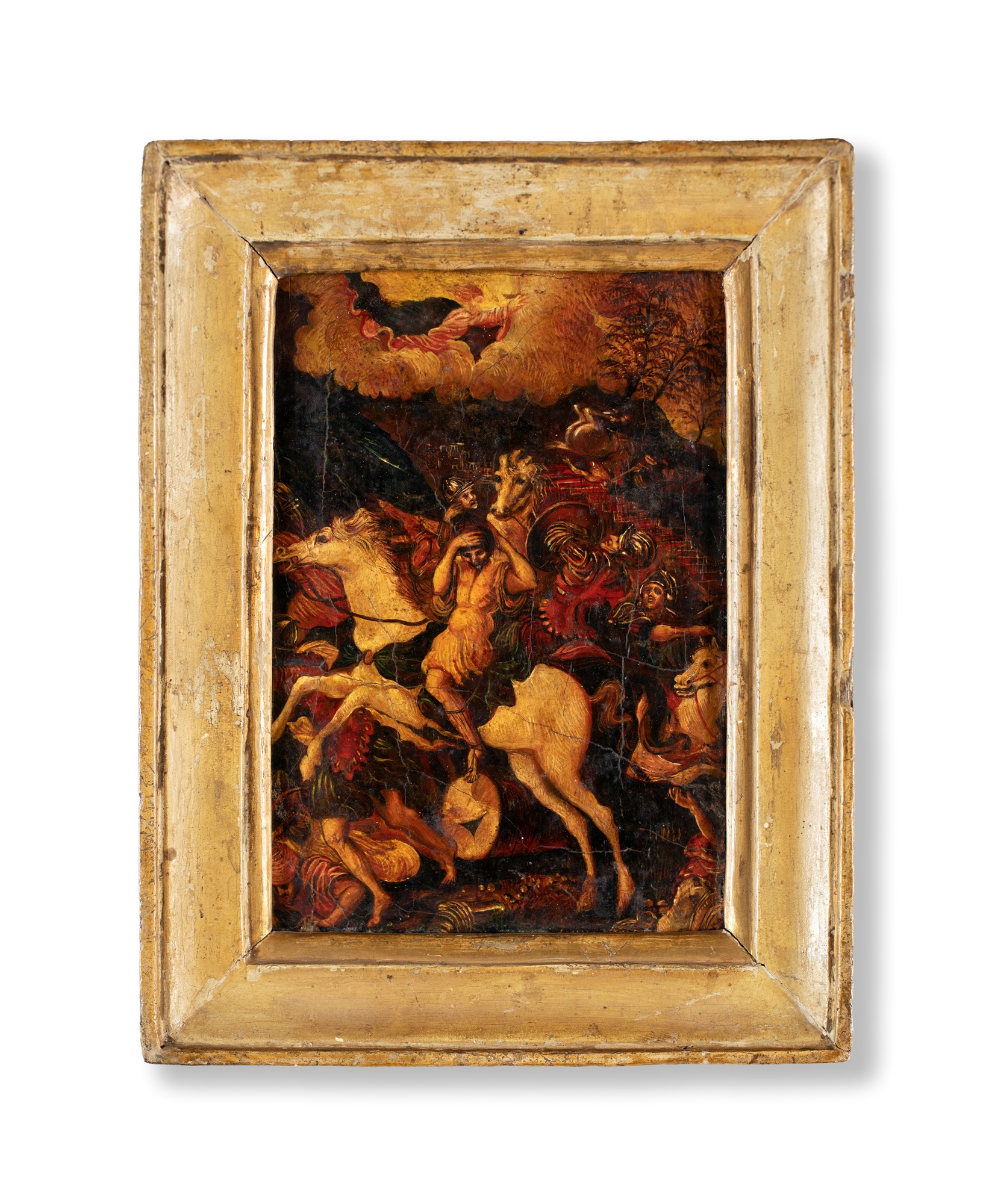 Pittore del XVI secolo Battaglia di cavalleria olio su pergamena applicata su tavola cm 16.5x11