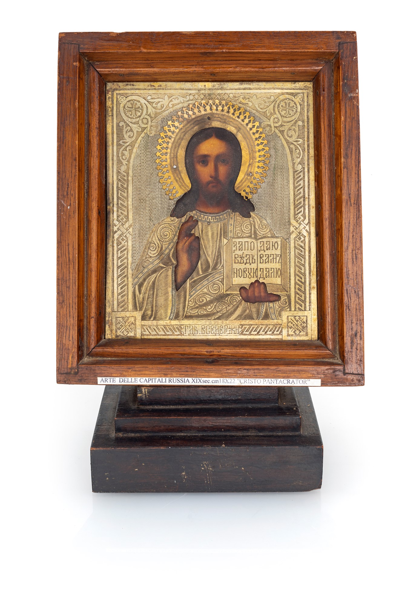 Icona, Russia XIX secolo raffigurante Cristo Pantocrator con riza in metallo; cornice modanata e supporto in legno. cm 21,5x17,5 (l'insieme: cm 35x25x11,5)