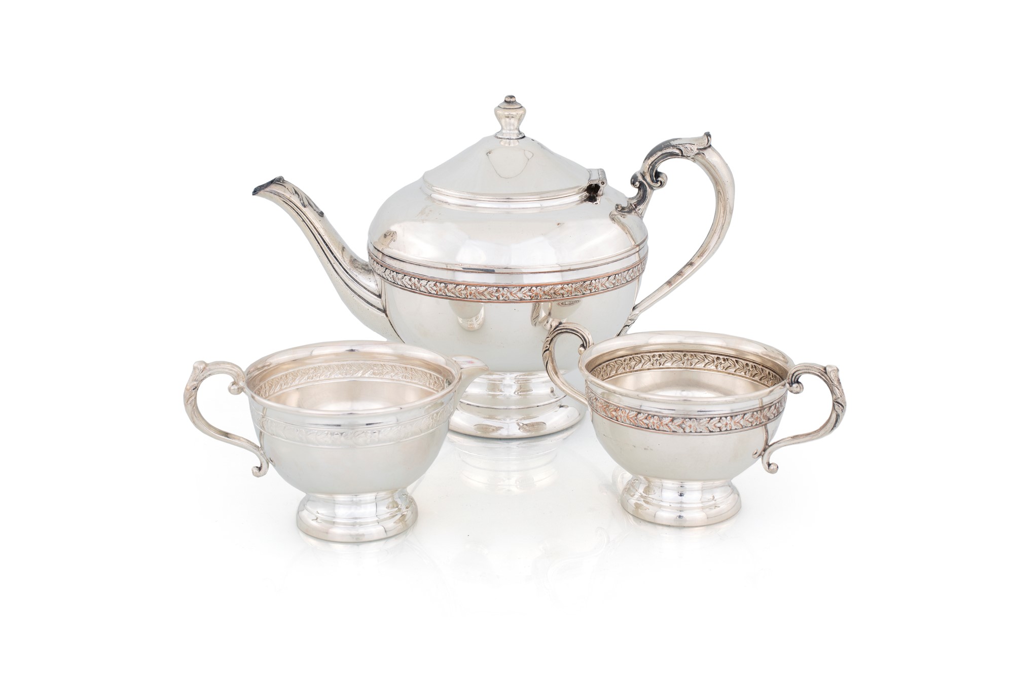 Servizio da tè in metallo argentato, Warren Plate S.P. Copper composto da teiera, lattiera e zuccheriera; corpi sferici ornati da una fascia percorsa da una ghirlanda. altezza cm 17 e cm 7