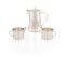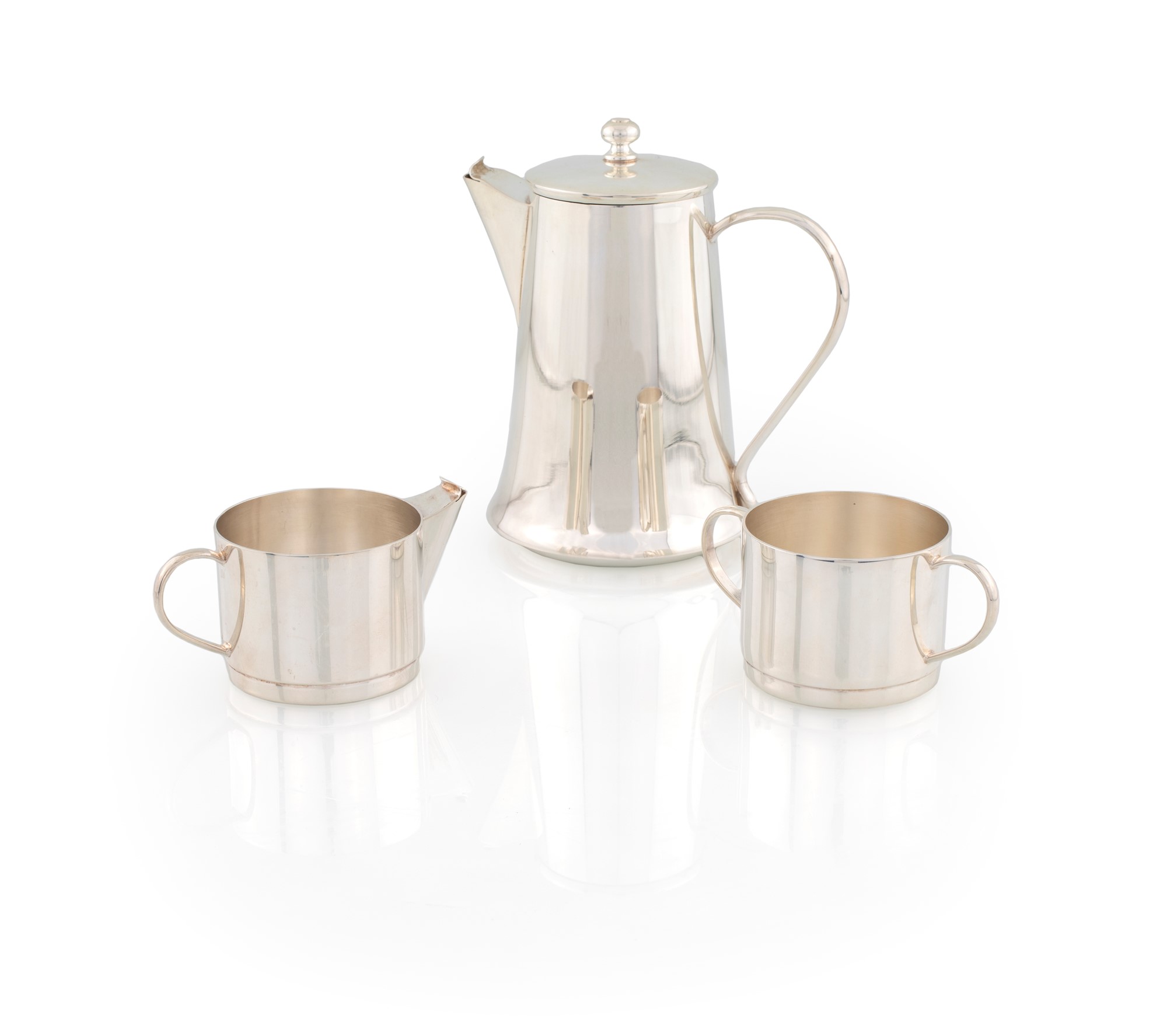 Solitaire in argento composto da caffettiera, lattiera e zuccheriera con corpi cilindrici lisci. altezza cm 15 e cm 5 - peso complessivo gr. 536