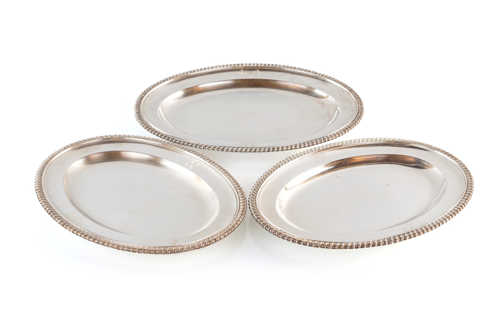 Tre vassoi in argento di forma ovale con profilo sottolineato da cordone. cm 36x26 e cm 32x24 (2) - peso complessivo gr. 2.604