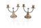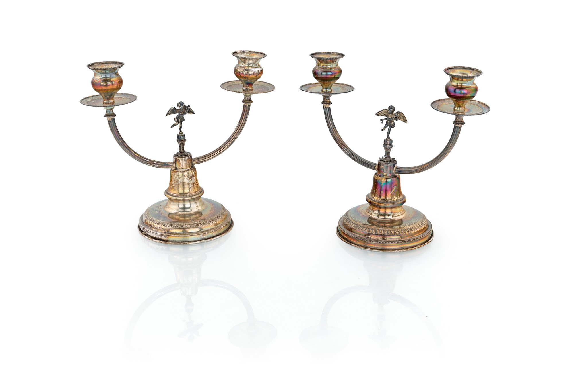 Coppia di doppieri in argento con portacandela a vaso e piccola figura scultorea di angioletto; base circolare. cm 18x19x10