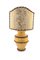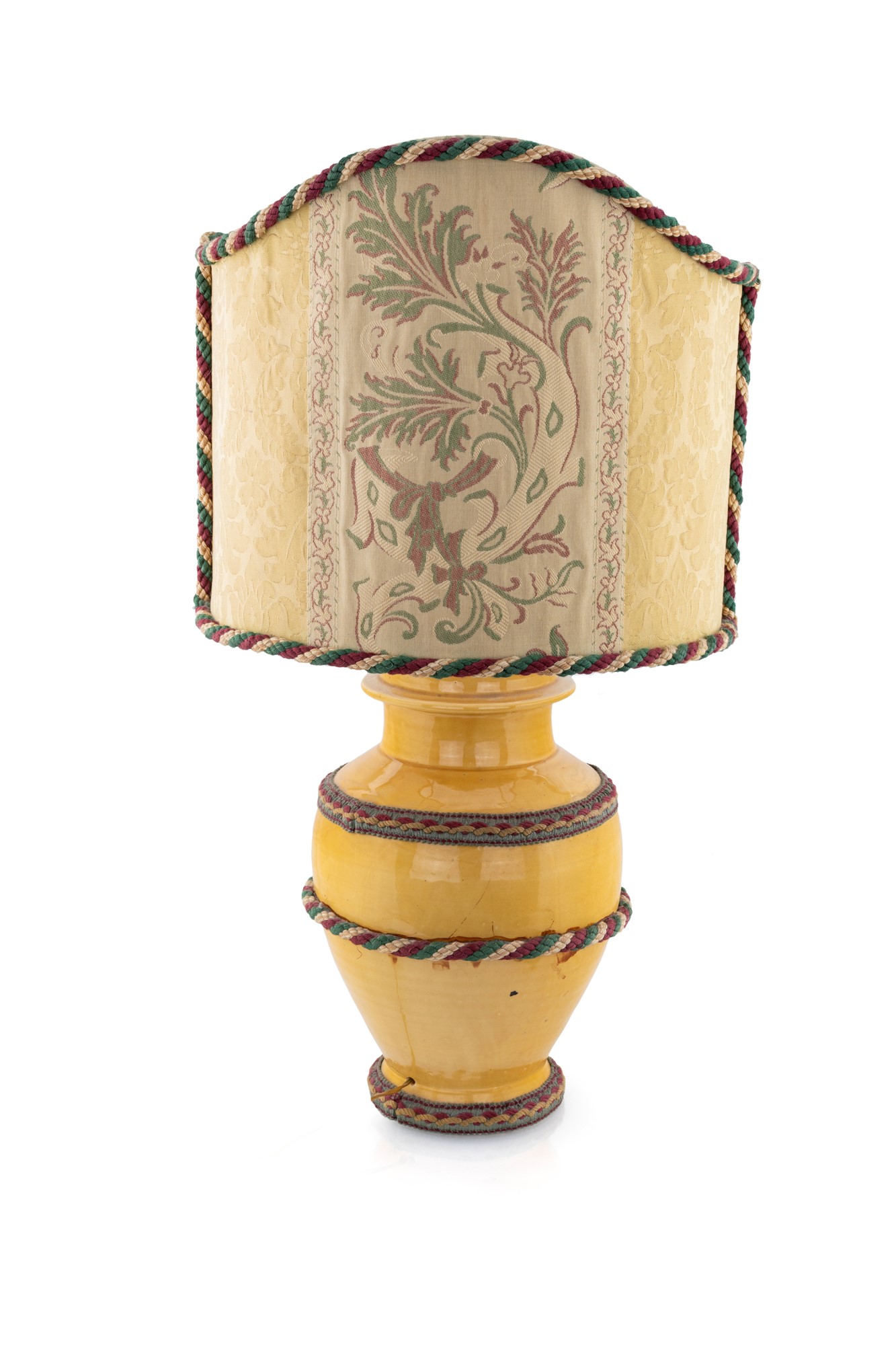 Lampada da tavolo in terracotta smaltata giallo senape abbellita da finiture in passamaneria; completa di ventola paraluce altezza complessiva cm 73