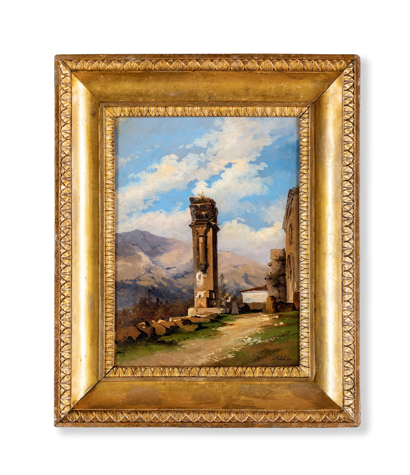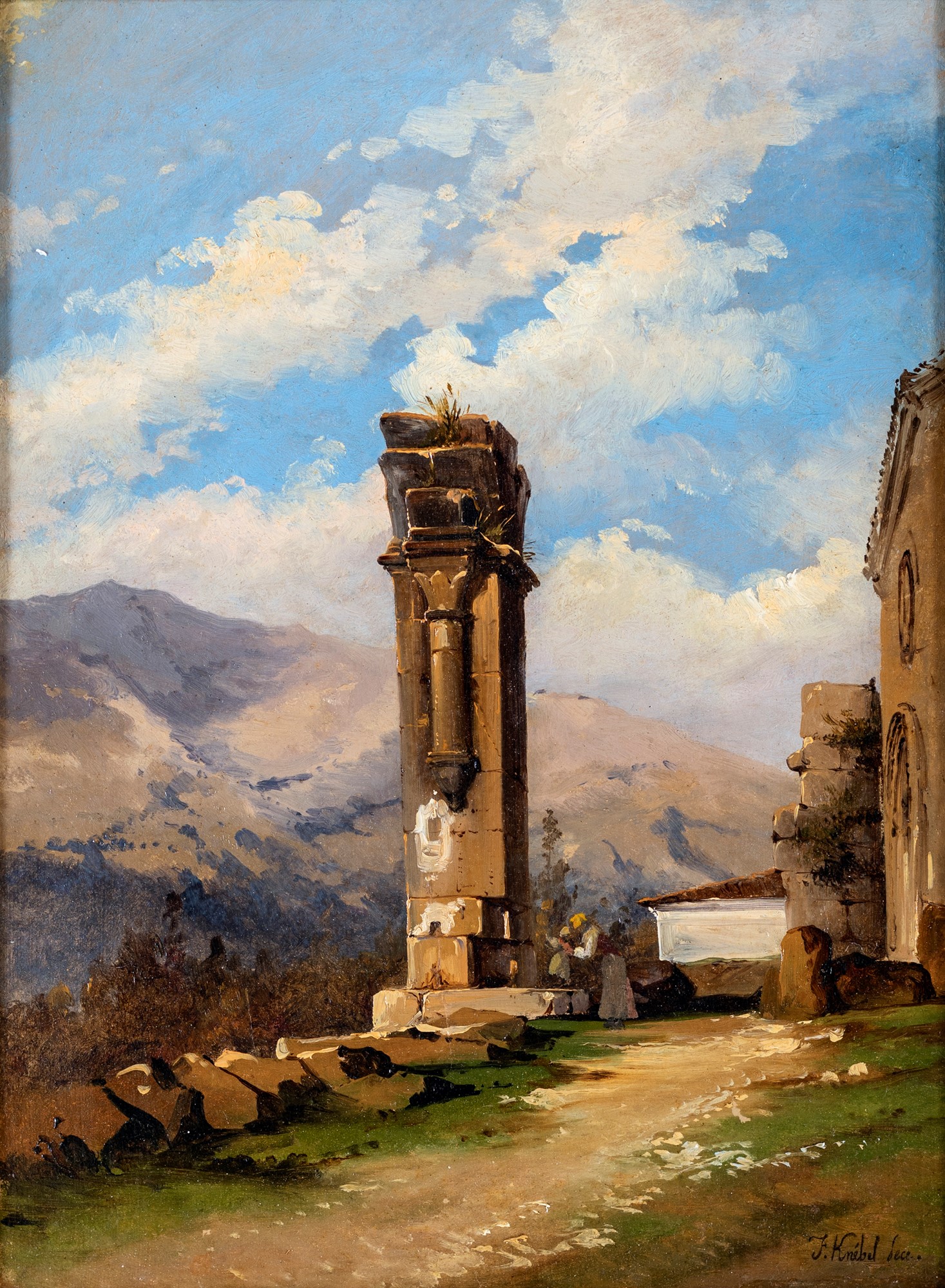 Charles-Francois Knébel La Sarraz 1809-Roma 1877 Paesaggio con rovine Firmato in basso a destra: F.Knebel fece olio su tela cm 37x28
