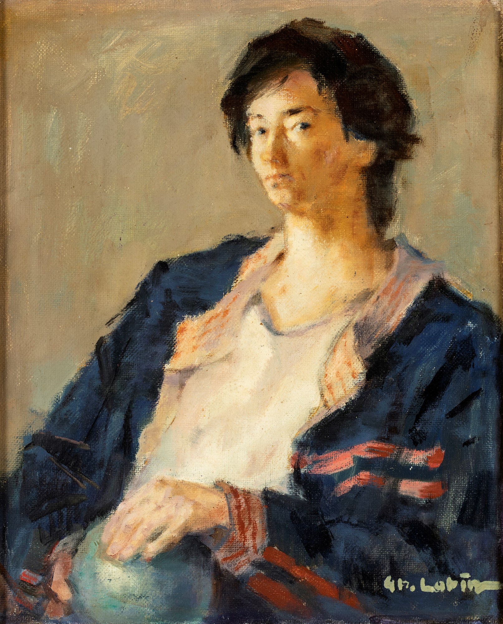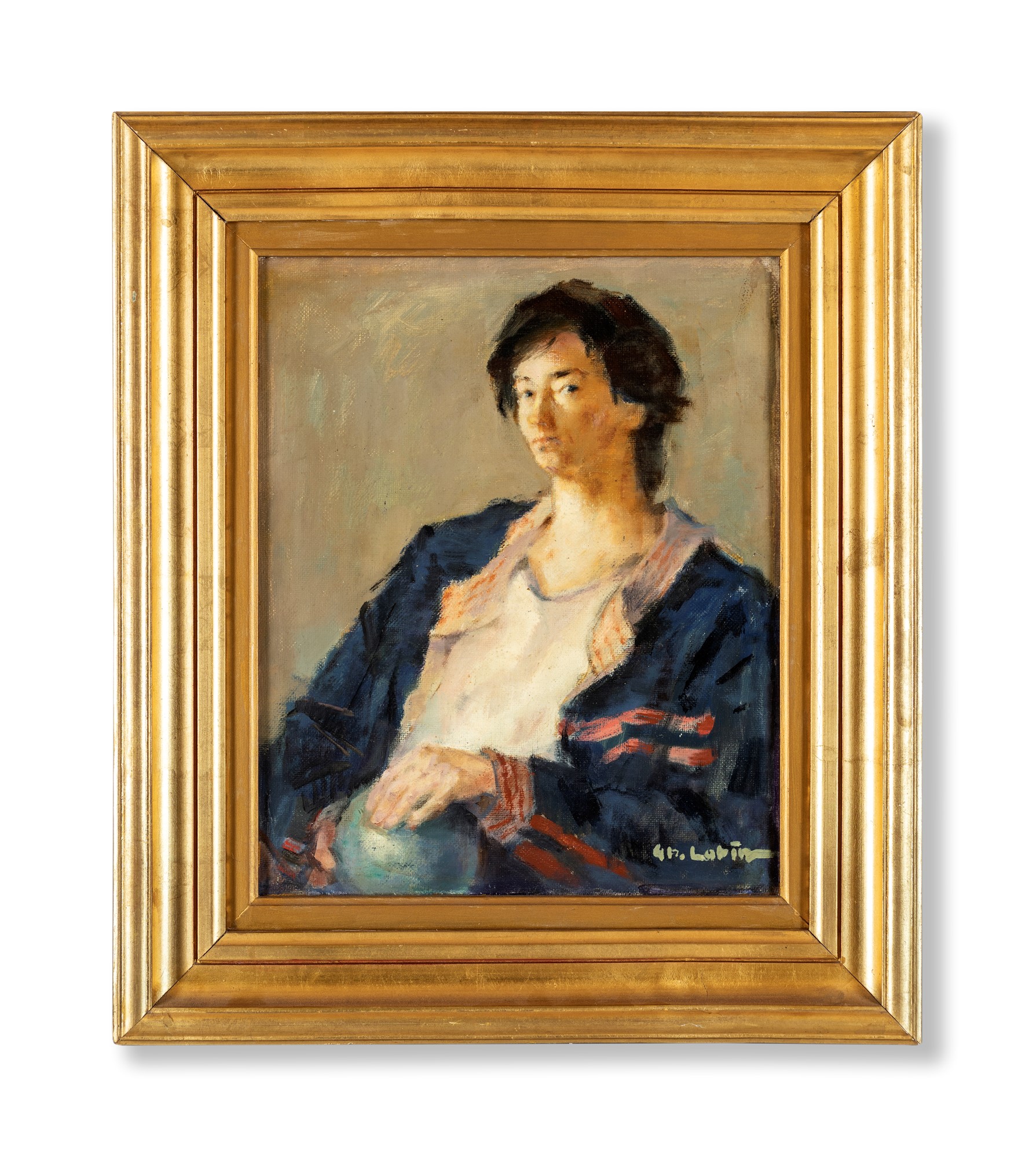 Gheorghe Labin Pufe?ti 1907-Gala?i 1977 Ritratto di giovane con globo terrestre Firmato Ghe. Labin in basso a destra. Bibliografia: catalogo della mostra di Artisti Rumeni, Galleria d'Arte, maggio-giugno 1989, Comitato Socialista per la Cultura e l'Educazione del comune di Bucarest. olio su cartone telato cm 43x35