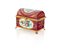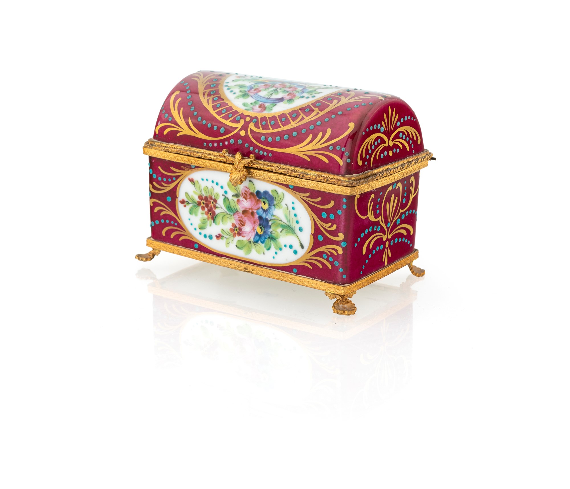 Cofanetto di porcellana e metallo decorato da composizioni floreali entro riserve su fondo amaranto con tralci dorati; montatura in metallo dorato. 8x10,5x6