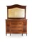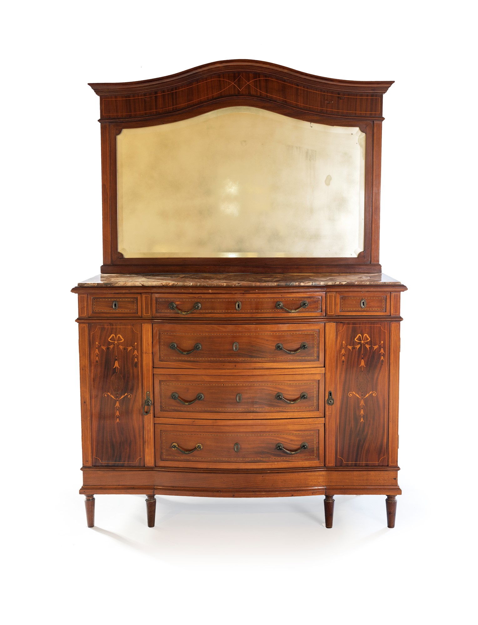 Cassapanca in mogano, Inghilterra, inizio del XX secolo facciata con parte centrale convessa, decorata da sottili filettature ed intarsi naturalistici in legno di frutto, scandita da tre cassetti compresi nella fascia e da tre sottostanti la cui apertura è vincolata dalle due antine laterali. Rifinito da piano incassato in marmo e sormontato da specchiera ad arco, poggia su piedi rastremati. cm 101x135x55 - la specchiera; altecca cm 95