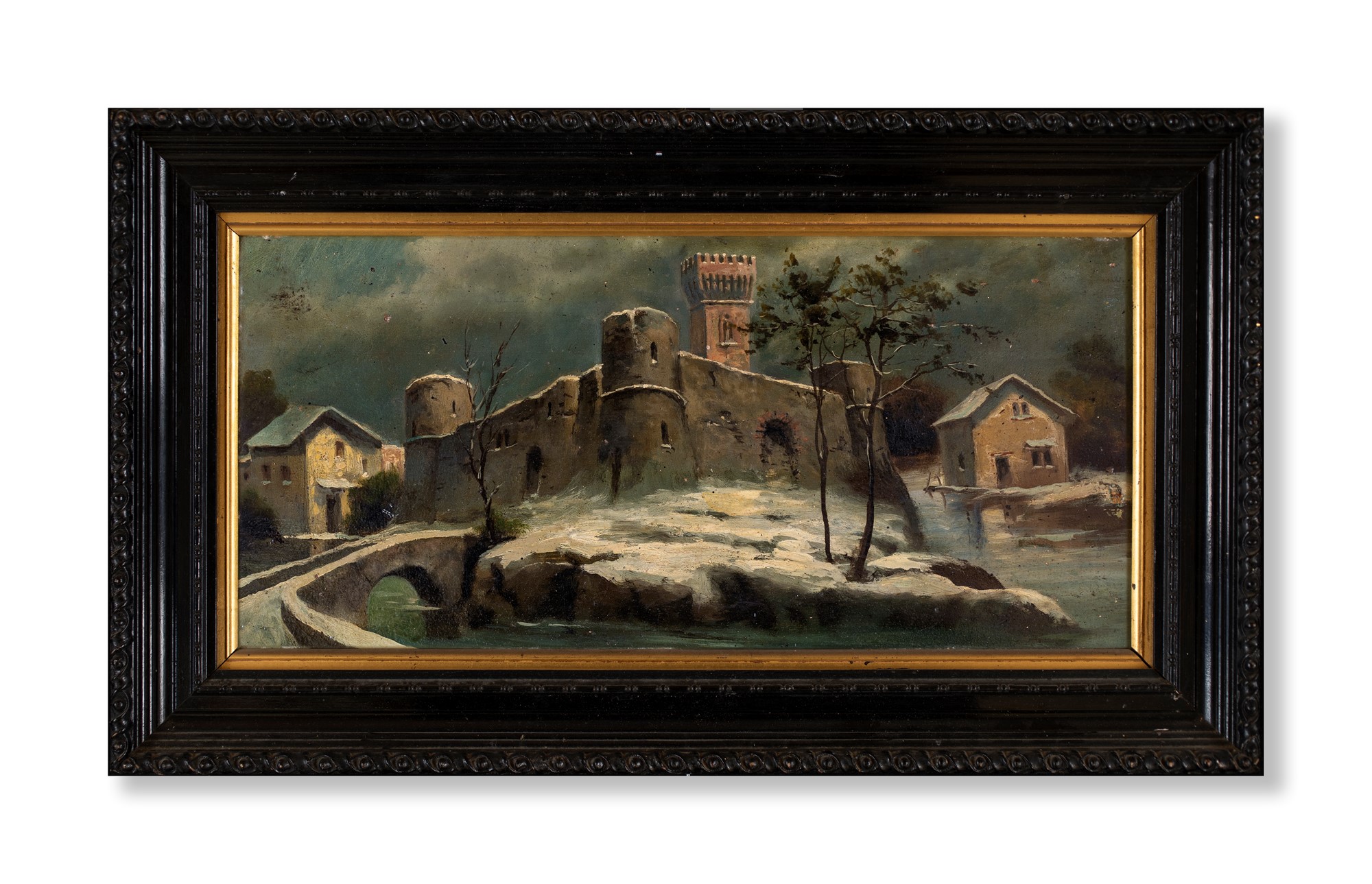 Pittore del XIX secolo Castello innevato olio su tavola cm 27x55,5