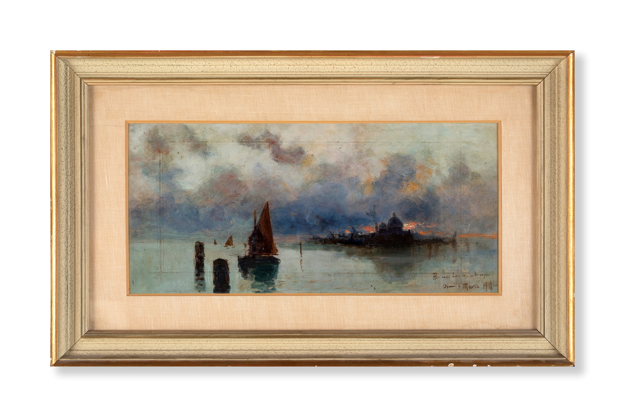 Pittore degli inizi del XX secolo Veduta di Venezia Firmato in basso a destra con dedica e data 1918 olio su tavoletta cm 22x48