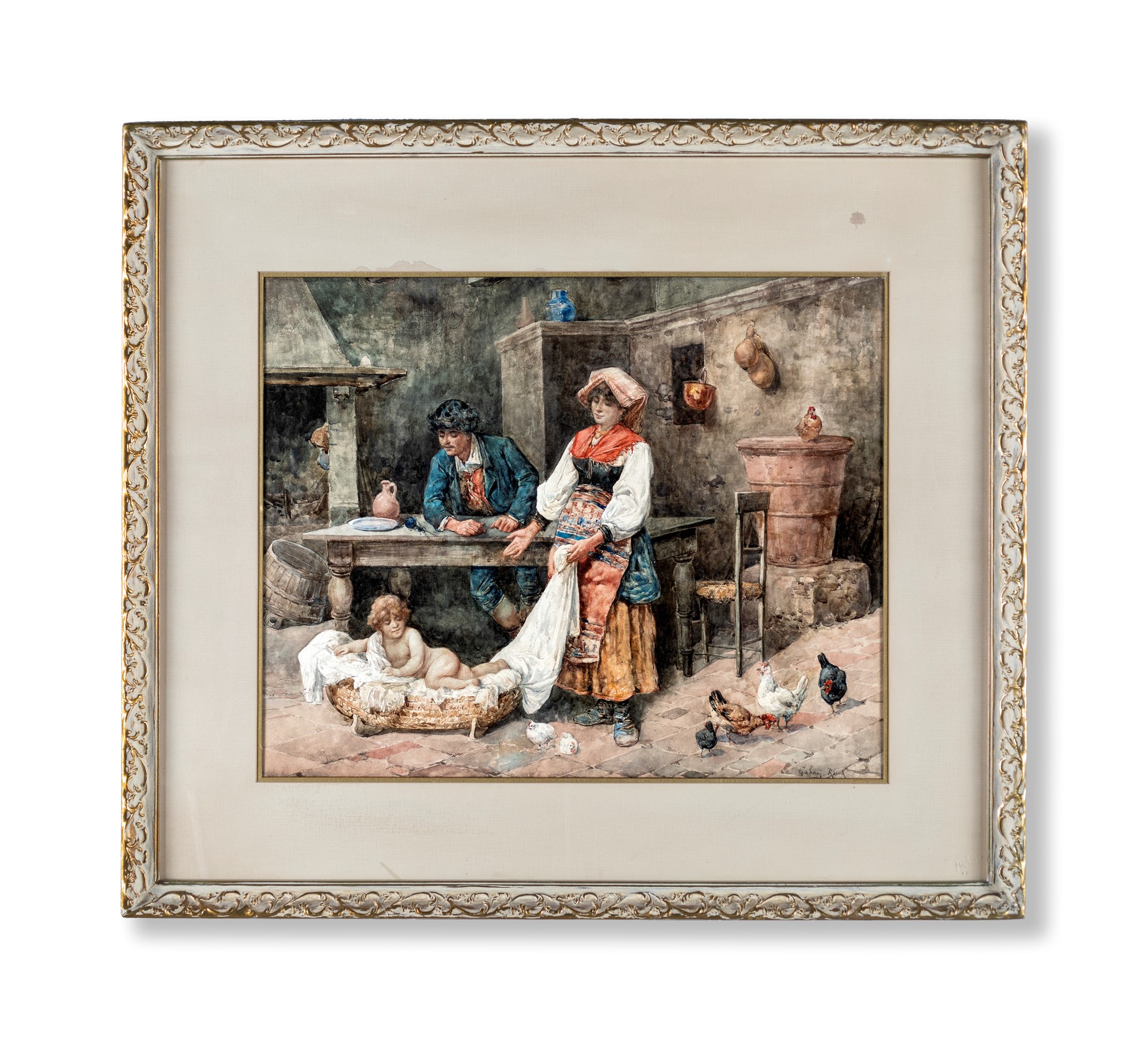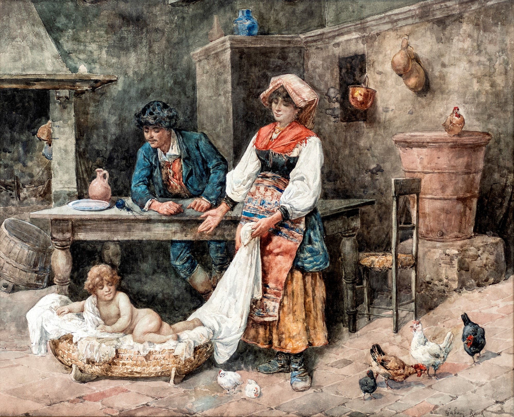 Giuseppe Gabani Senigallia 1846-Roma 1899 Famiglia contadina Firmato in basso a destra Gabani Roma acquerelli su carta cm 47x60