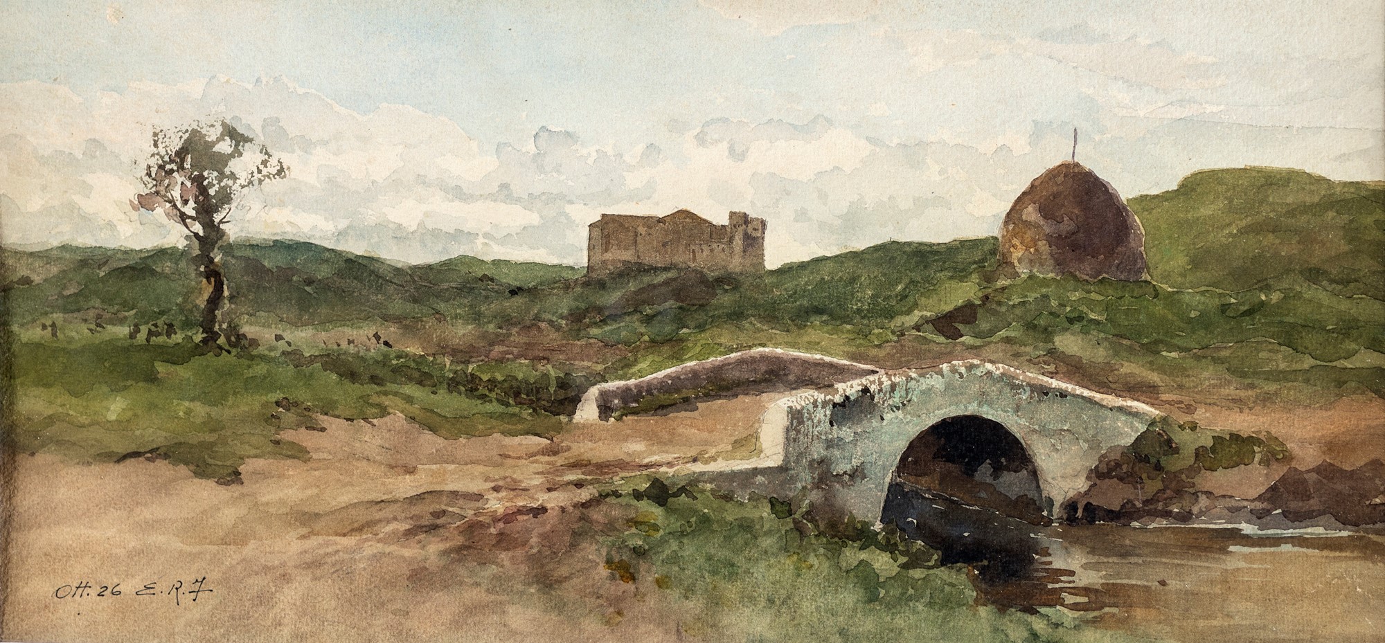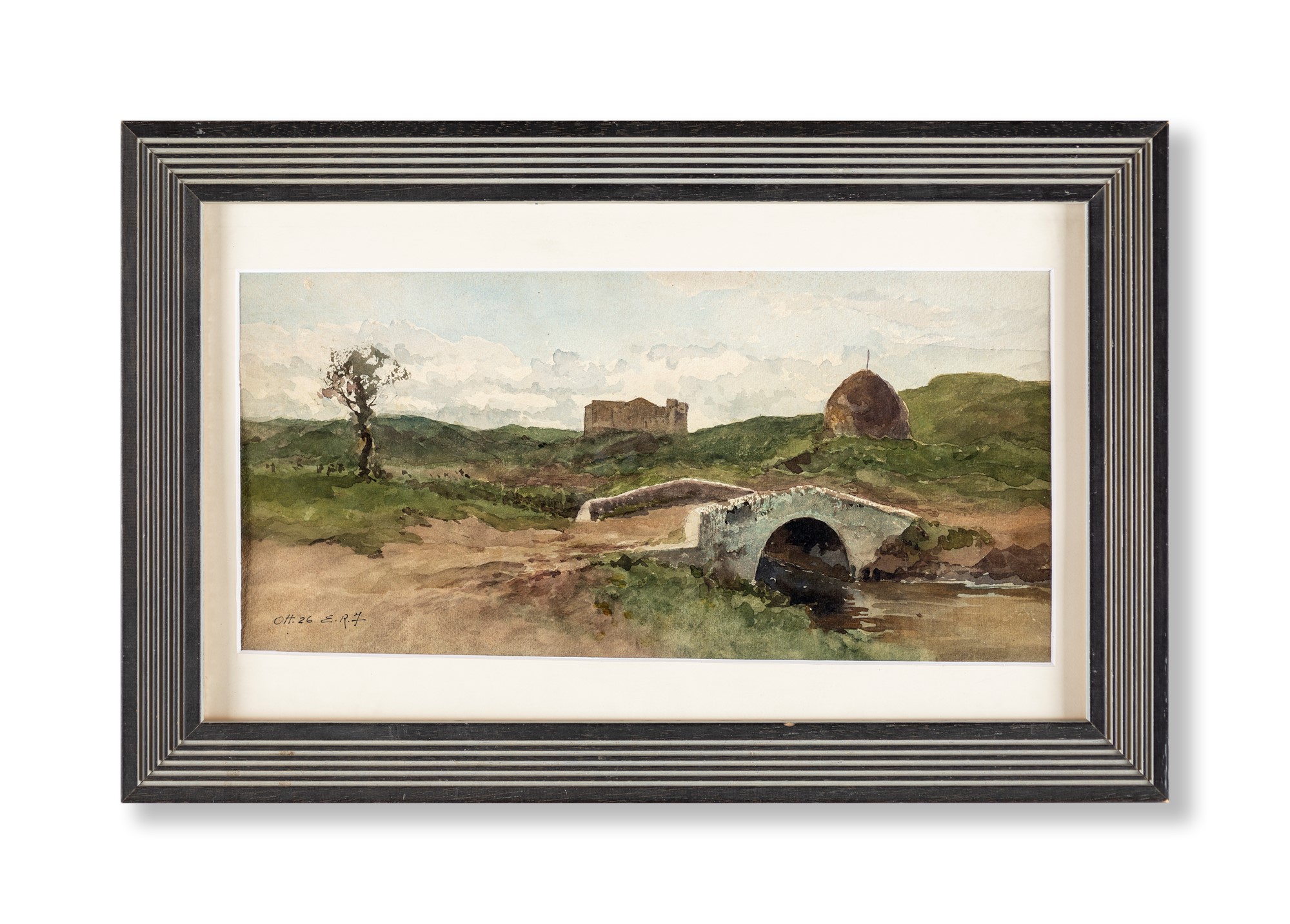 Ettore Roesler Franz 1845-1907 Paesaggio con castello Firmato e datato in basso a sinistra acquerelli su carta cm 21x44