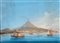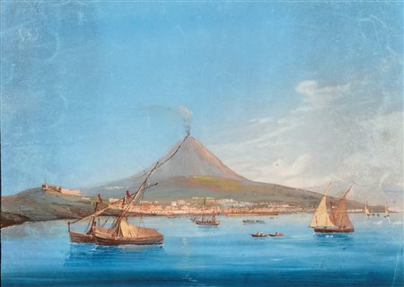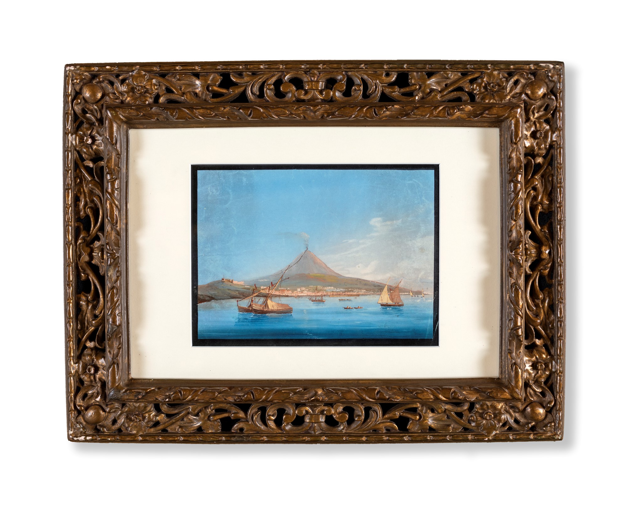 Pittore del XIX secolo Catania vista dal mare con l'Etna Entro cornice traforata gouache su carta cm 31x25