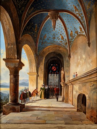 Friedrich August Elsasser Berlino 1810-Roma 1845 Portico con figure Firmato e datato in basso a destra: F.A.Elsasser 1838 olio su tela cm 45x37