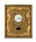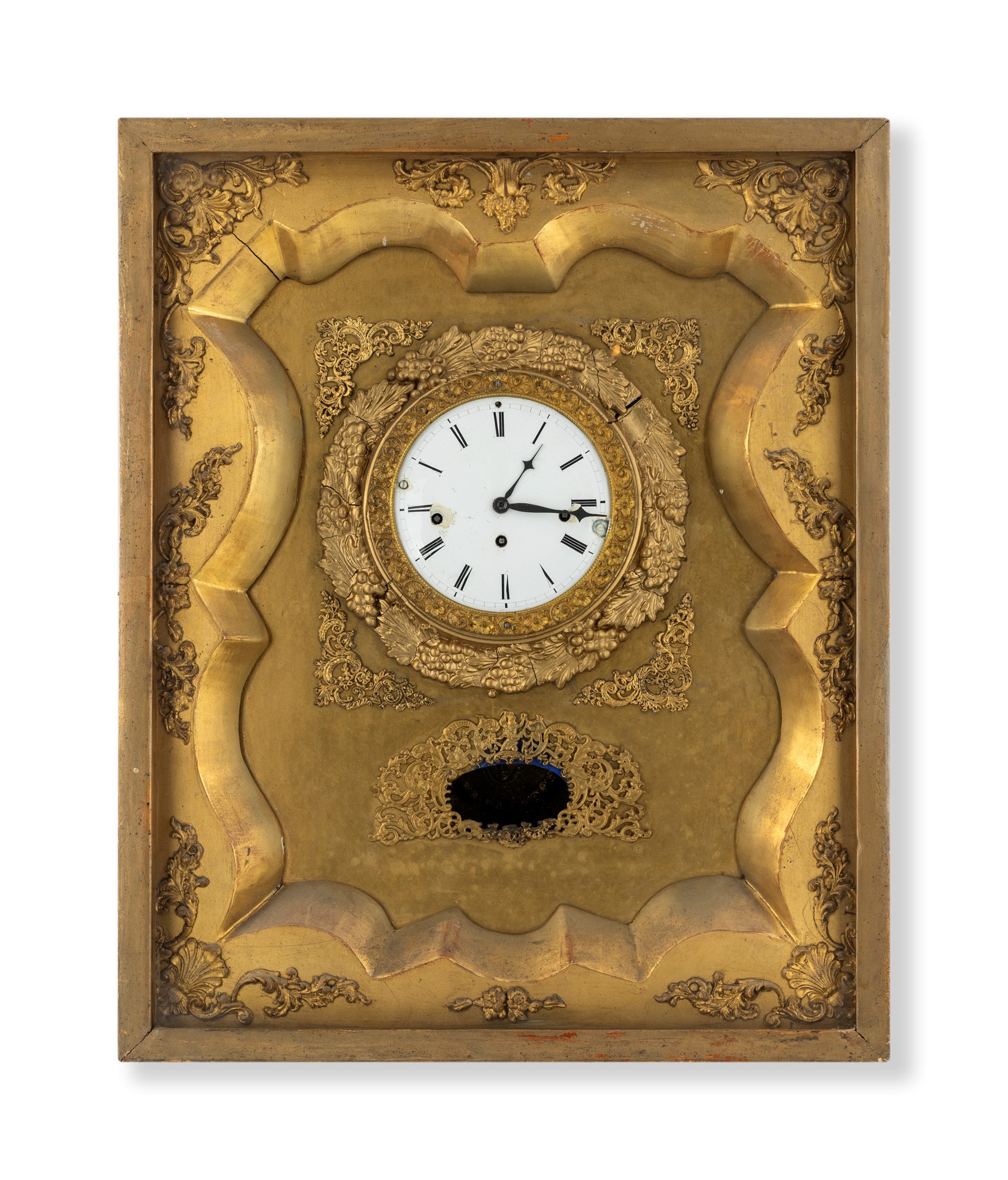 Orologio da muro in legno dorato, Austria XIX secolo con cassa a vassoio impreziosita da rilievi ornamentali naturalistici in pastiglia; quadrante circolare in smalto bianco a due fori di carica e fascia oraria a numeri romani. cm 54,5x44,5x15