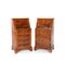 Coppia di comodini in noce con filettature intarsiate a motivi geometrici; facciata scandita da un'anta a ribalta che cela un vano e quattro tiretti in colonna con maniglie in bronzo. cm 76x38,5x30,5