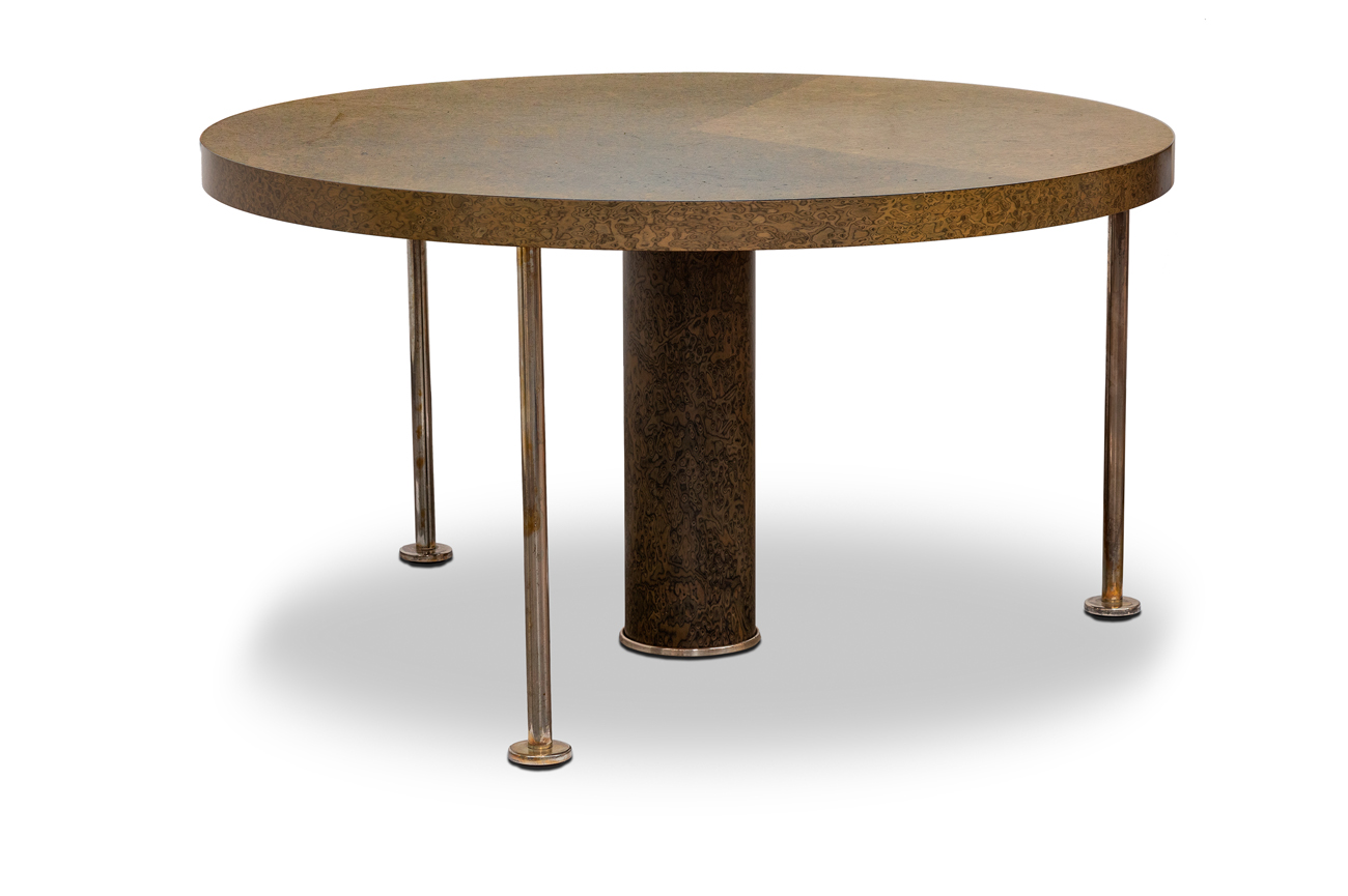 Tavolo con piano in tamburato e gambo centrale con impiallacciatura in radica tranciato precomposto verde salvia e gambe in tubo di ottone dorato