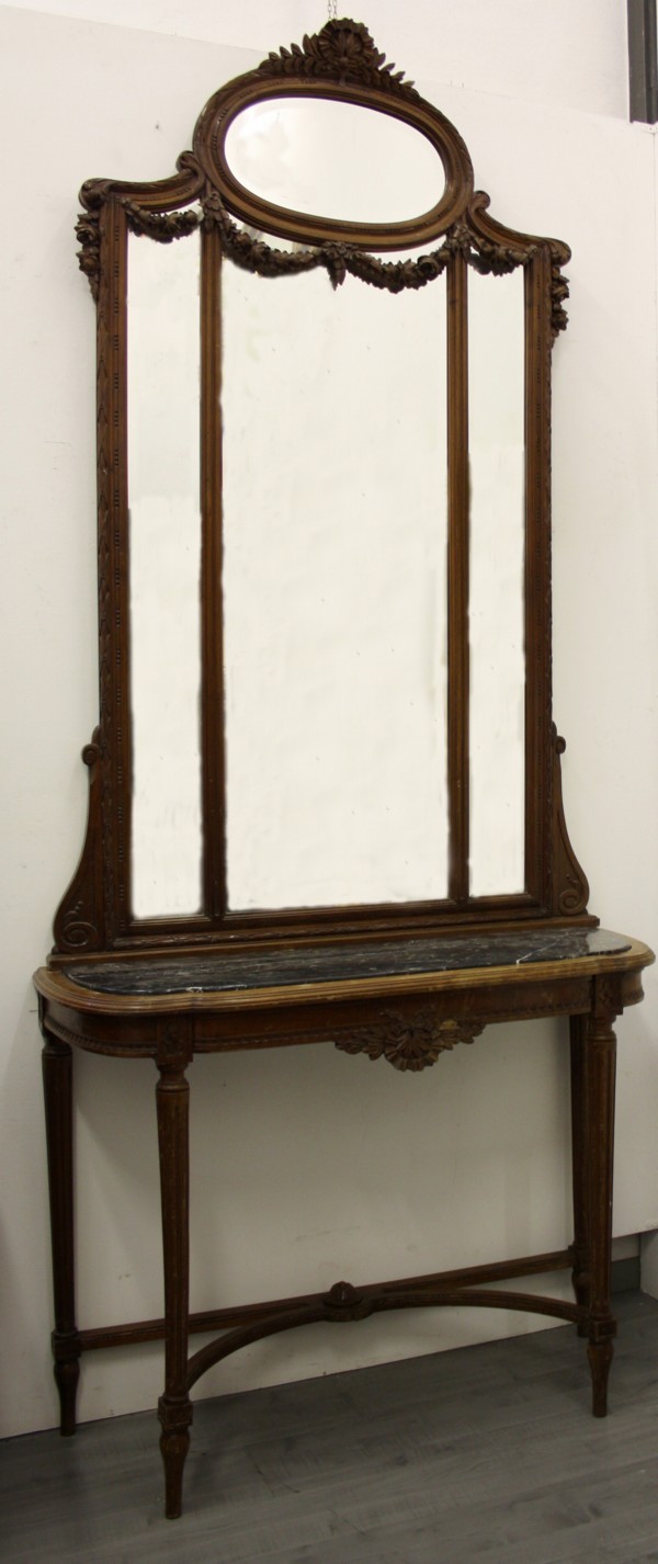 Firmato. Console in legno intagliato con specchio e piano in marmo grigio. Inizi XX secolo. Difetti. Mis. Lung. cm. 119 Alt. cm. 275 Prof. cm. 44 ca.