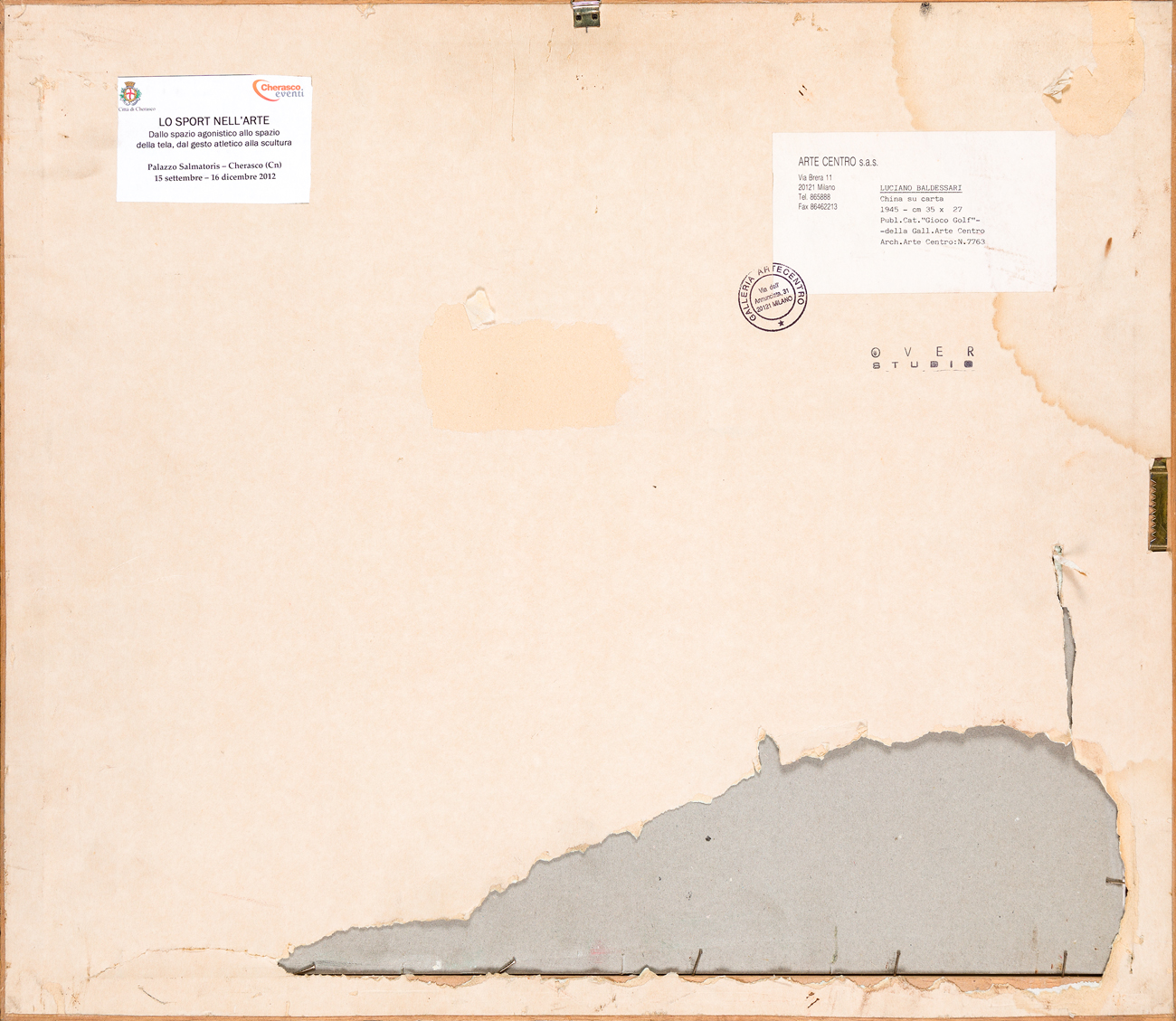Etichetta dell'esposizione 'Lo sport nell'arte. dallo spazio agonistico allo spazio della tela, dal gesto atletico alla scultura - Palazzo Salmatoris, Cherasco' al retro del cartone protettivo