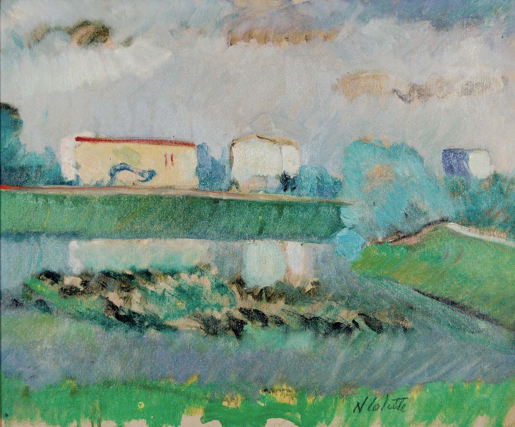 COLETTI NANDO Treviso 1907 -1979 Paesaggio lungo il Sile (anni '70) olio su cartone telato 50x60 cm firma in basso a destra autentica del figlio Ennio Coletti su foto