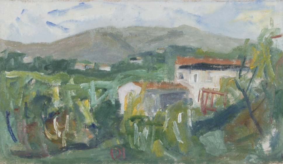 DALLA ZORZA CARLO Venezia 1896 - 1977 Asolo verso il Grappa olio su cartone telato 14x24,5 cm firma in basso al centro, titolo e dedica della Sig.ra Teresa Sensi Dalla Zorza al retro