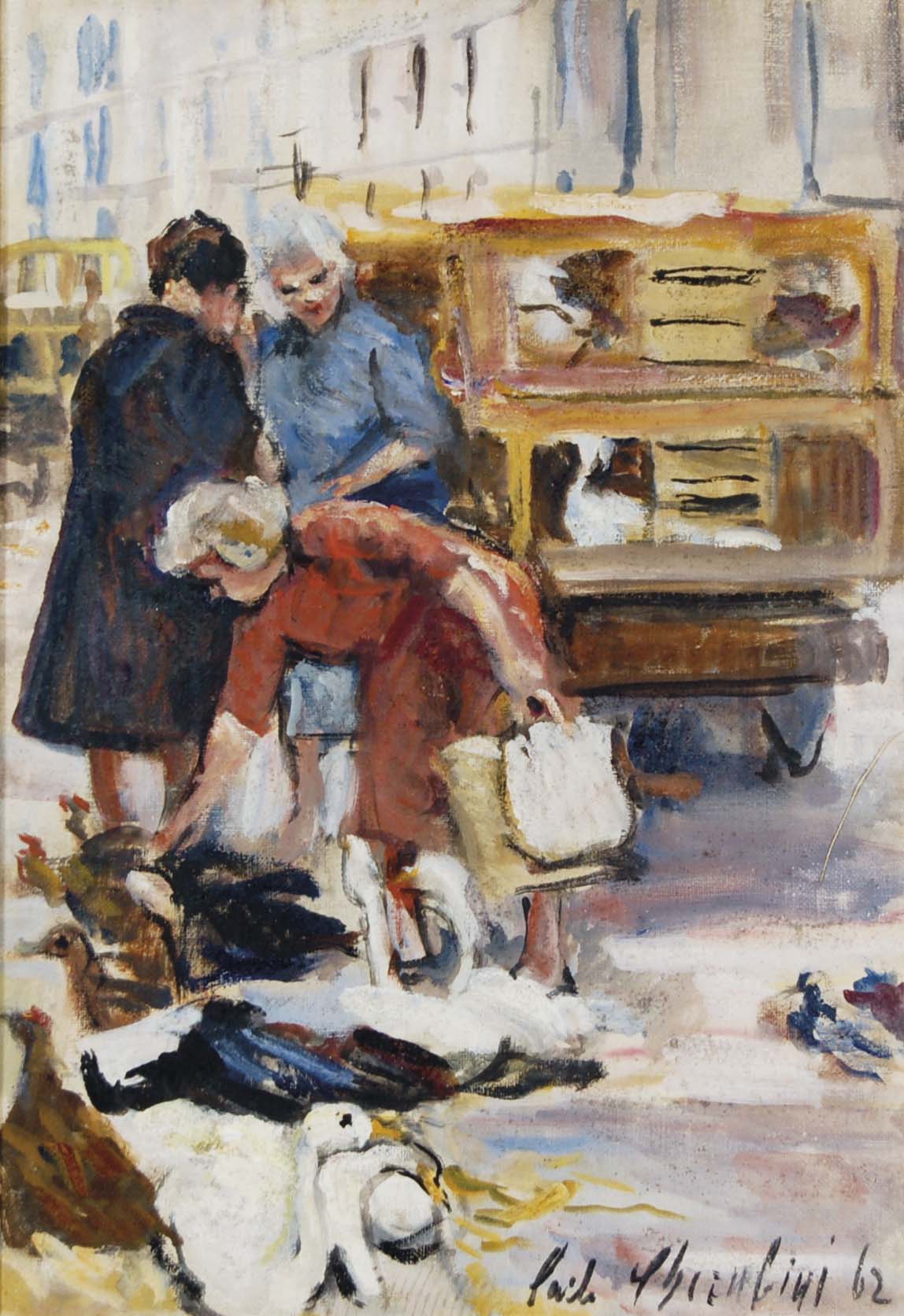 CHERUBINI CARLO Ancona 1897 - Venezia 1978 Marchands de volailles 1962 olio su tela 50x35 cm firma e data in basso a destra firma data e titolo al retro