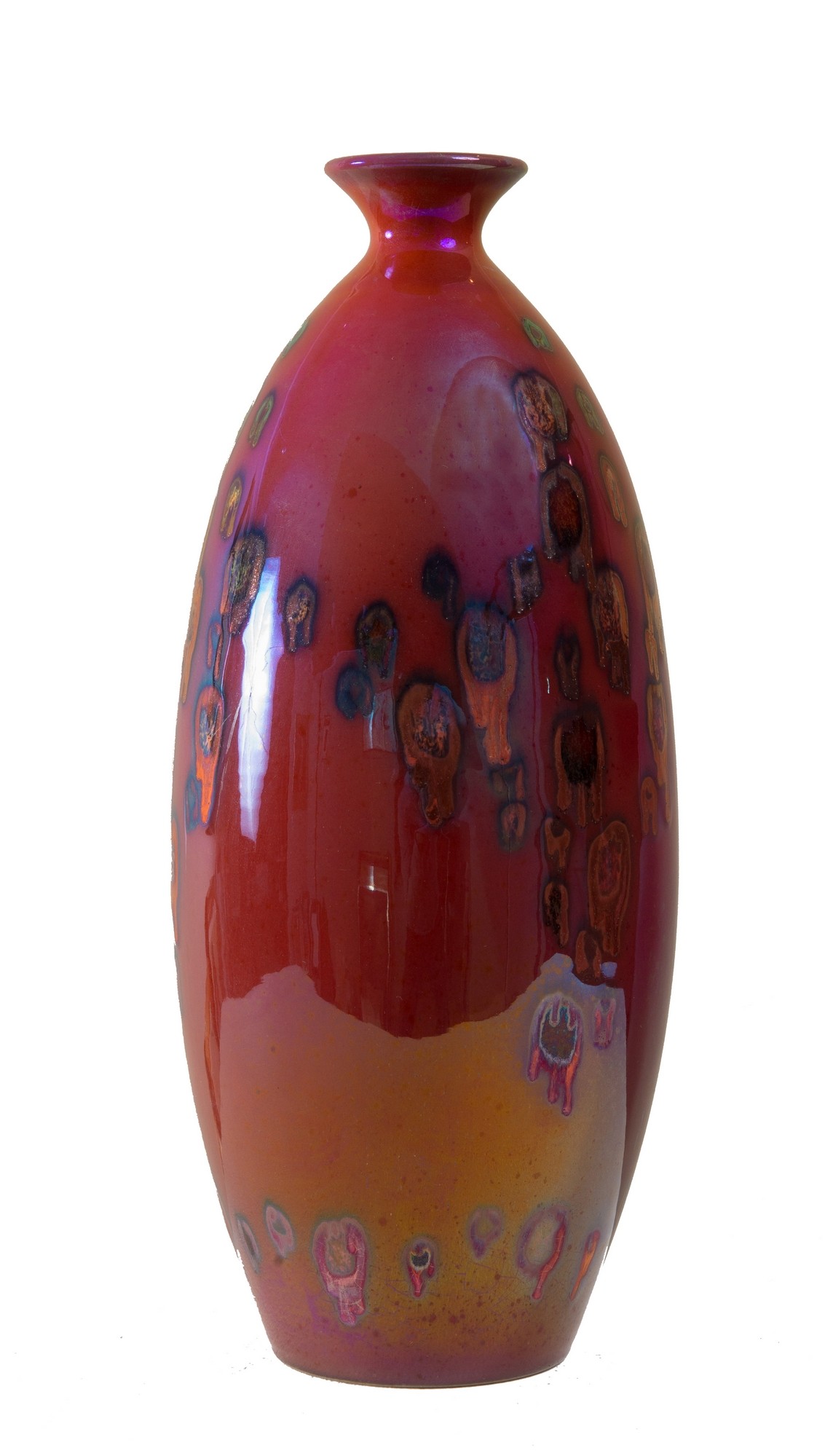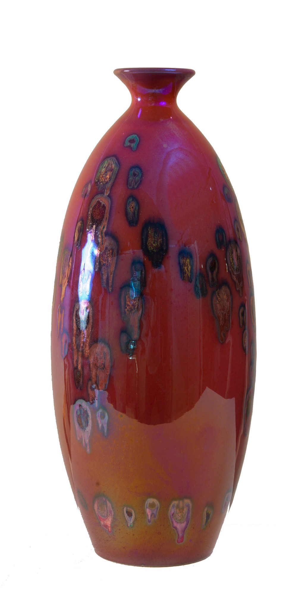 GIORDANO TRONCONI (Faenza, 1932). Vaso in maiolica a lustro. Decorazione astratta su base rossa. Sotto la base firma ed etichetta dell’Ente Ceramica Faenza. Cm 34.5.