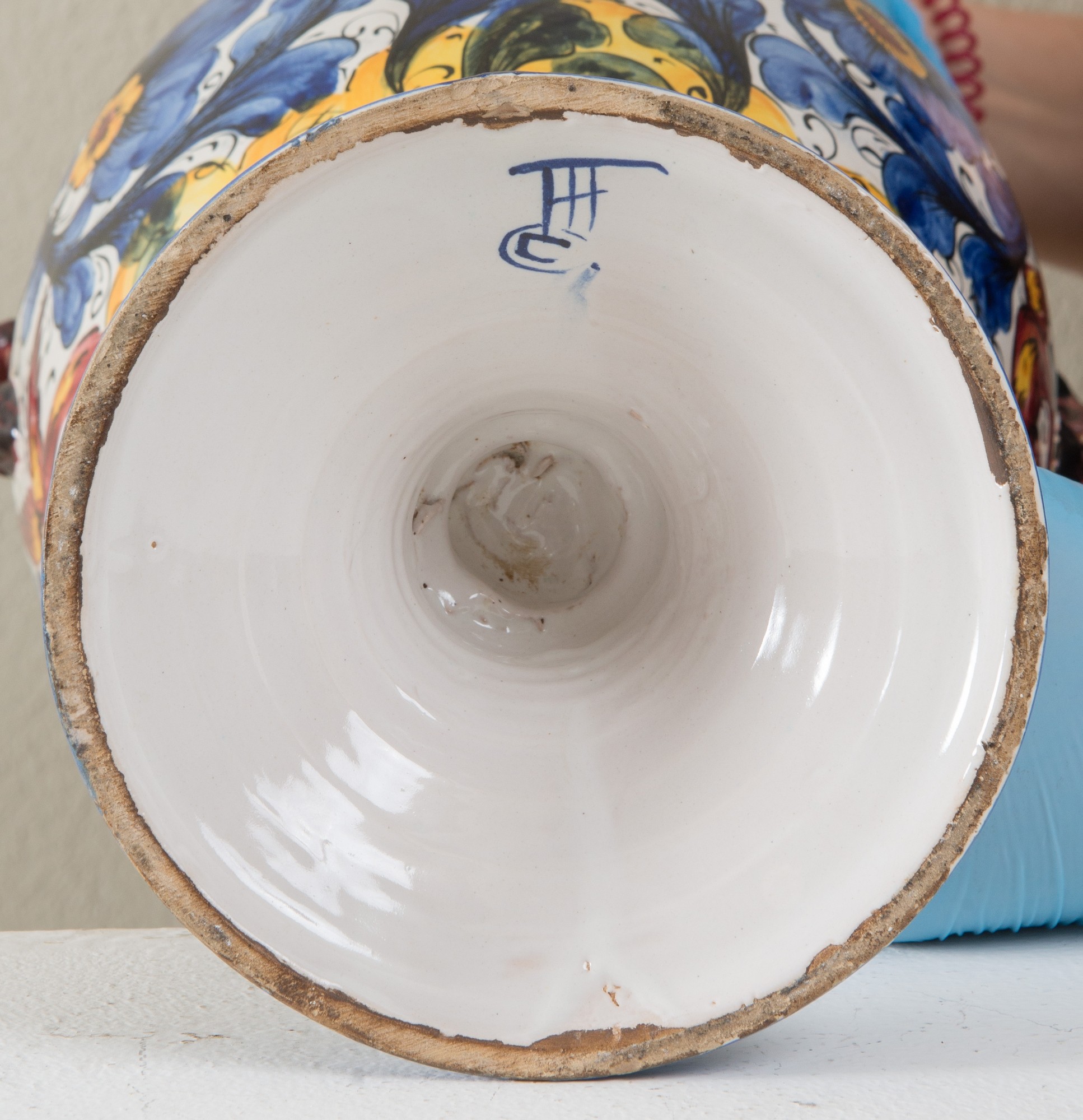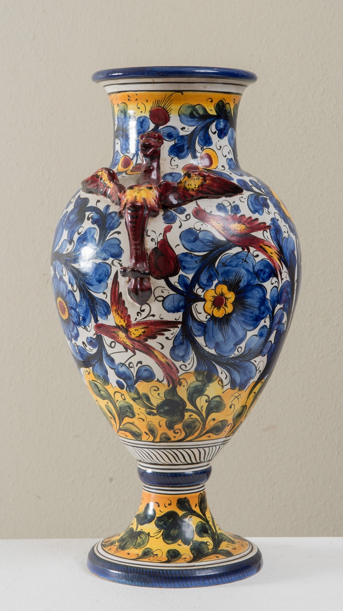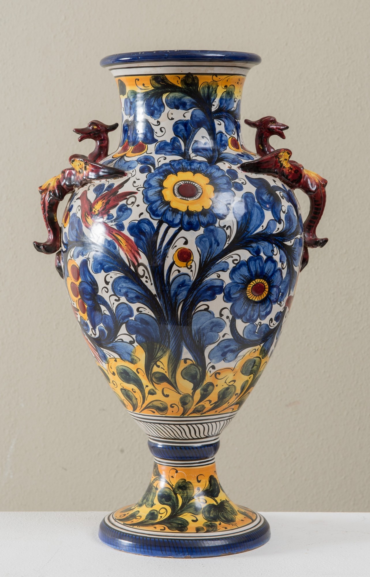 VASO IN MAIOLICA, XX secolo. Maiolica smaltata, con prese a foggia di drago. Reca marchio non identificato sotto la base. Cm 43x28.