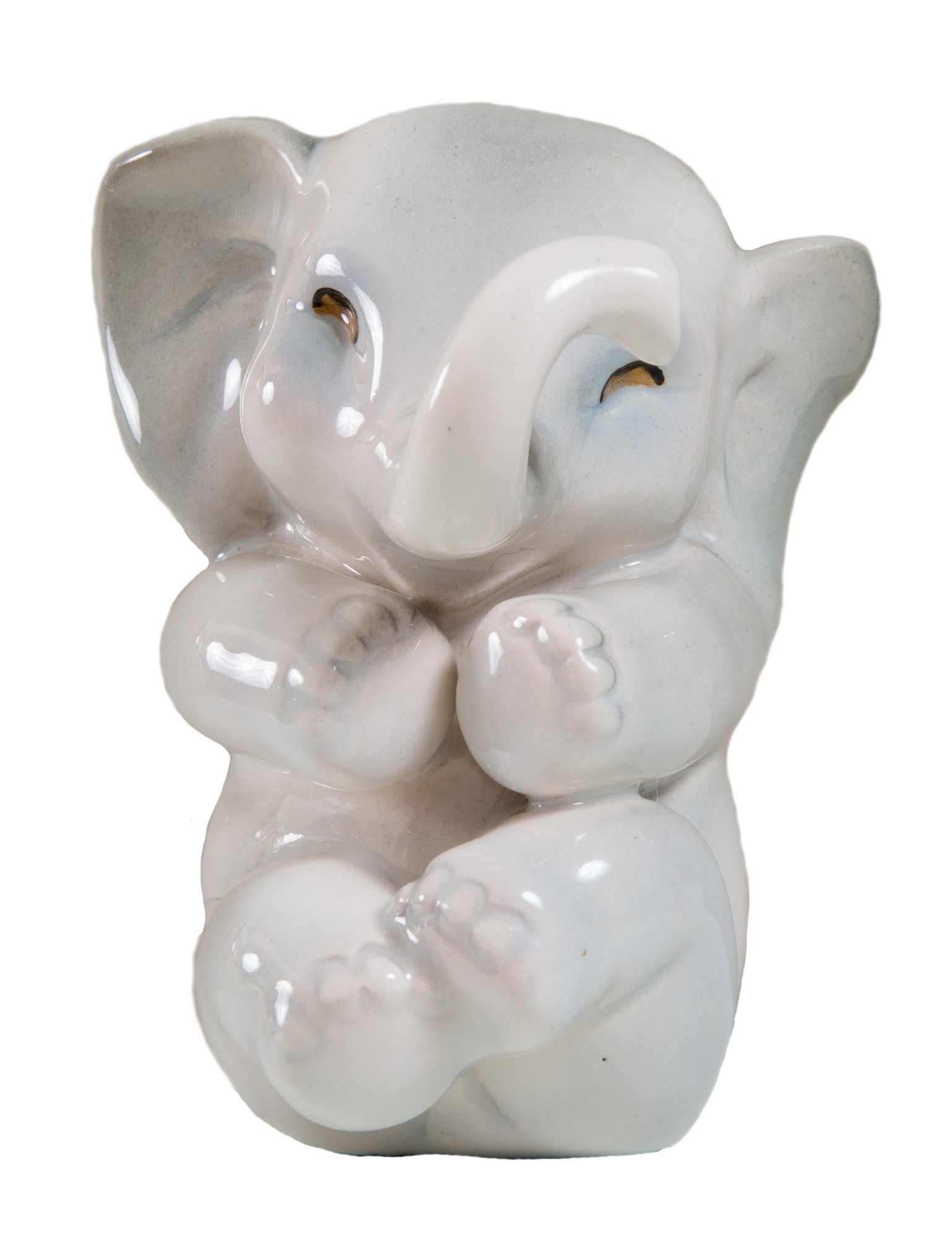HELEN KONIG SCAVINI (Torino 1886 - 1974), Manifattura Lenci, Torino, anni 30. « Elefantino ». Ceramica formata a colaggio e smaltata in policromia sotto vestrina. Firmata sotto la base in nero Lenci – Made in Italy. Cm 10. Pubblicata in A. Panzetta, Le ceramiche Lenci. Catalogo dell'Archivio storico 1928-1964, Allemandi, Torino 1992, cat. n. 992, p. 297.