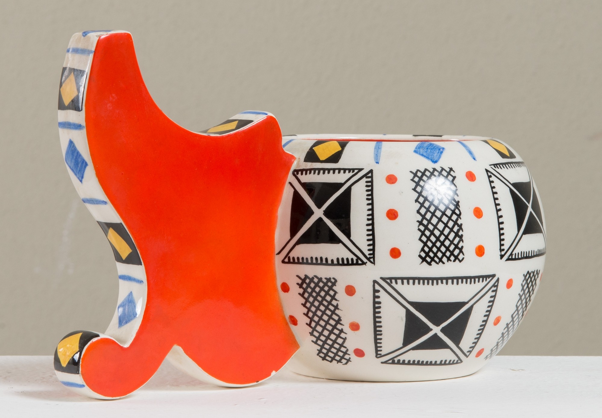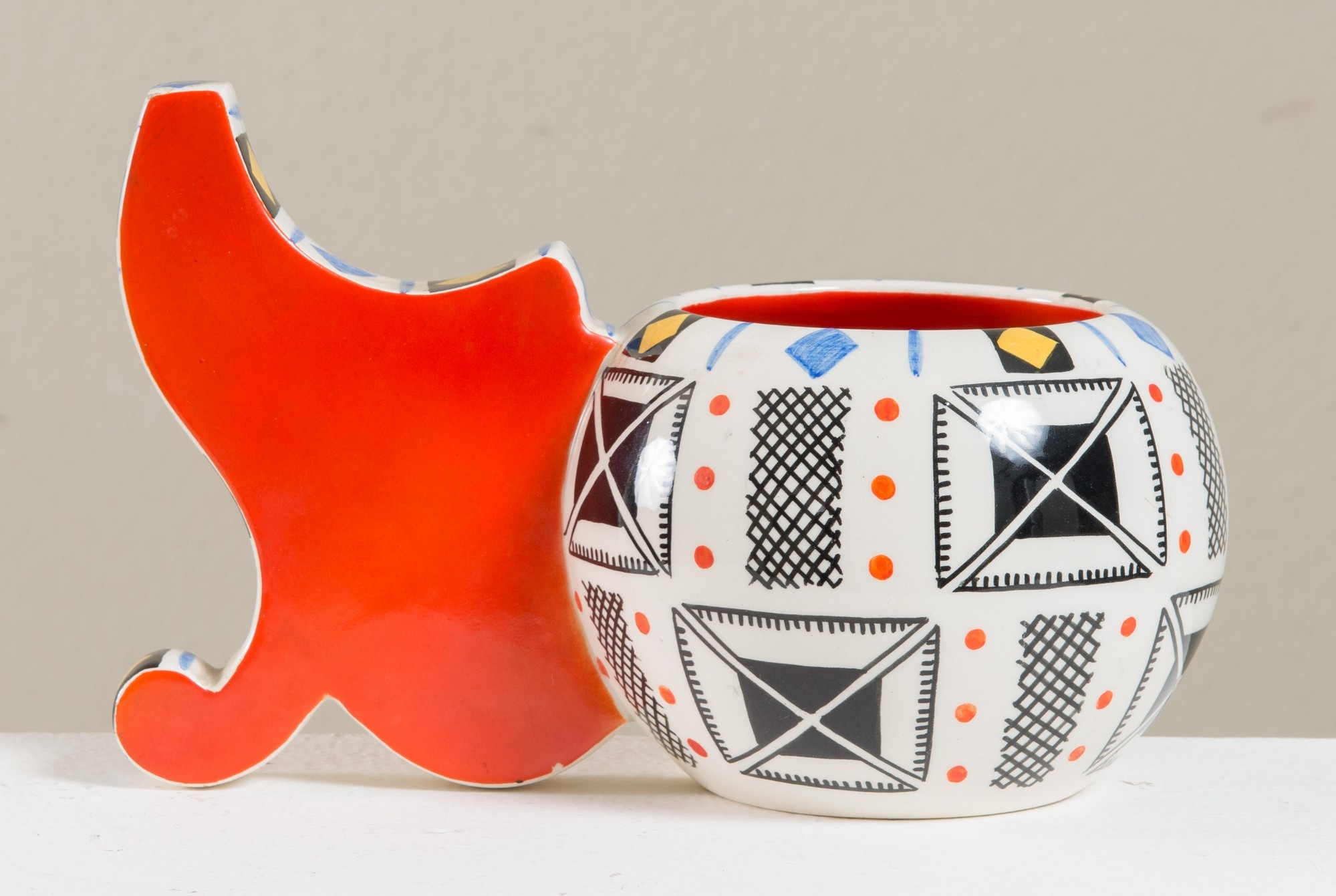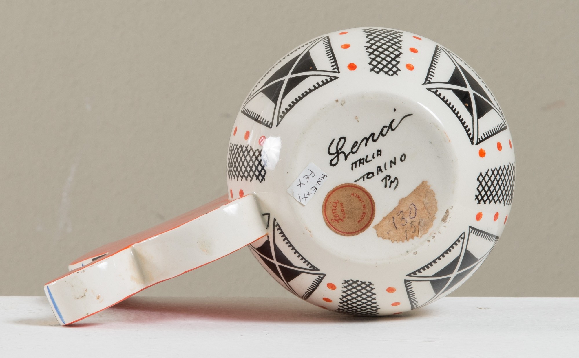 MANIFATTURA LENCI, XX secolo. Vaso in porcellana con manico importante rosso e decorata da motivi geometrici e sui toni del rosso, azzurro e ciano. Sotto la base reca iscrizione Lenci – Italia – Torino e sigla. Pubblicato in «Le ceramiche Lenci», A. Panzetta, ed. Allemandi. Cm 13x21x12,5.