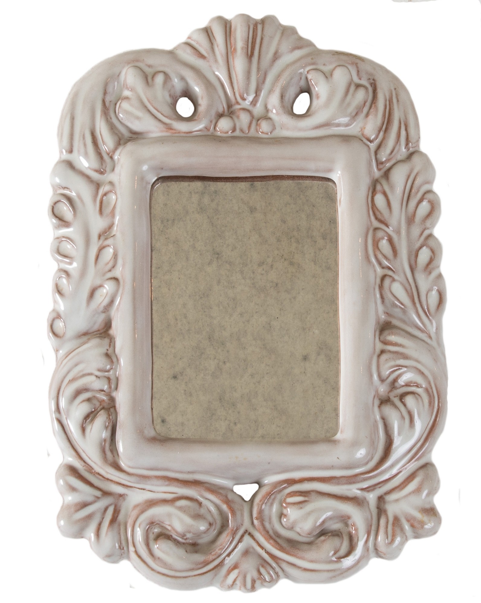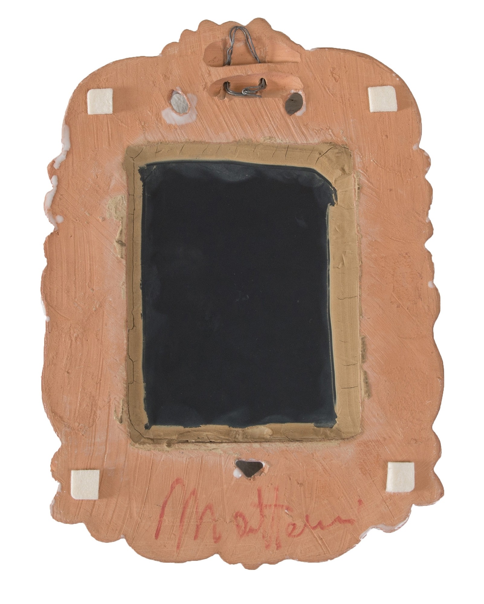 MATTEUCCI (Faenza, XX secolo). Specchiera in maiolica, lavorata a stampo, dipinta di bianco. Opera firmata al retro “Matteucci”. Cm 26x18.