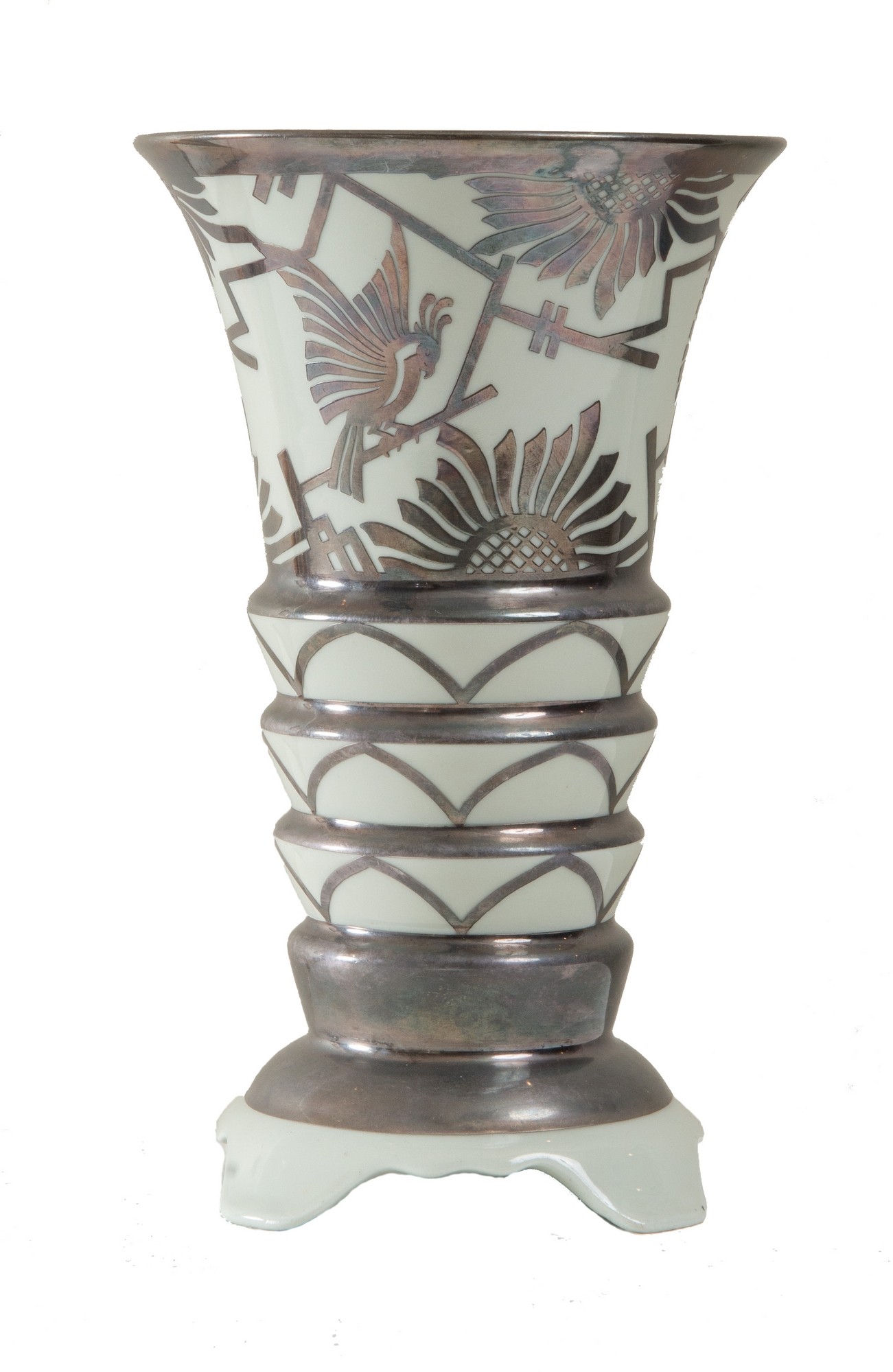 PIRKEN HAMMER, Cecoslovacchia, XX secolo. Vaso in porcellana con decorazioni in argento raffiguranti uccelli del paradiso e girasoli. Base circolare con quattro piedini, recante marchio e numero di tiratura 4126 II. Cm 20; Diametro cm 12.