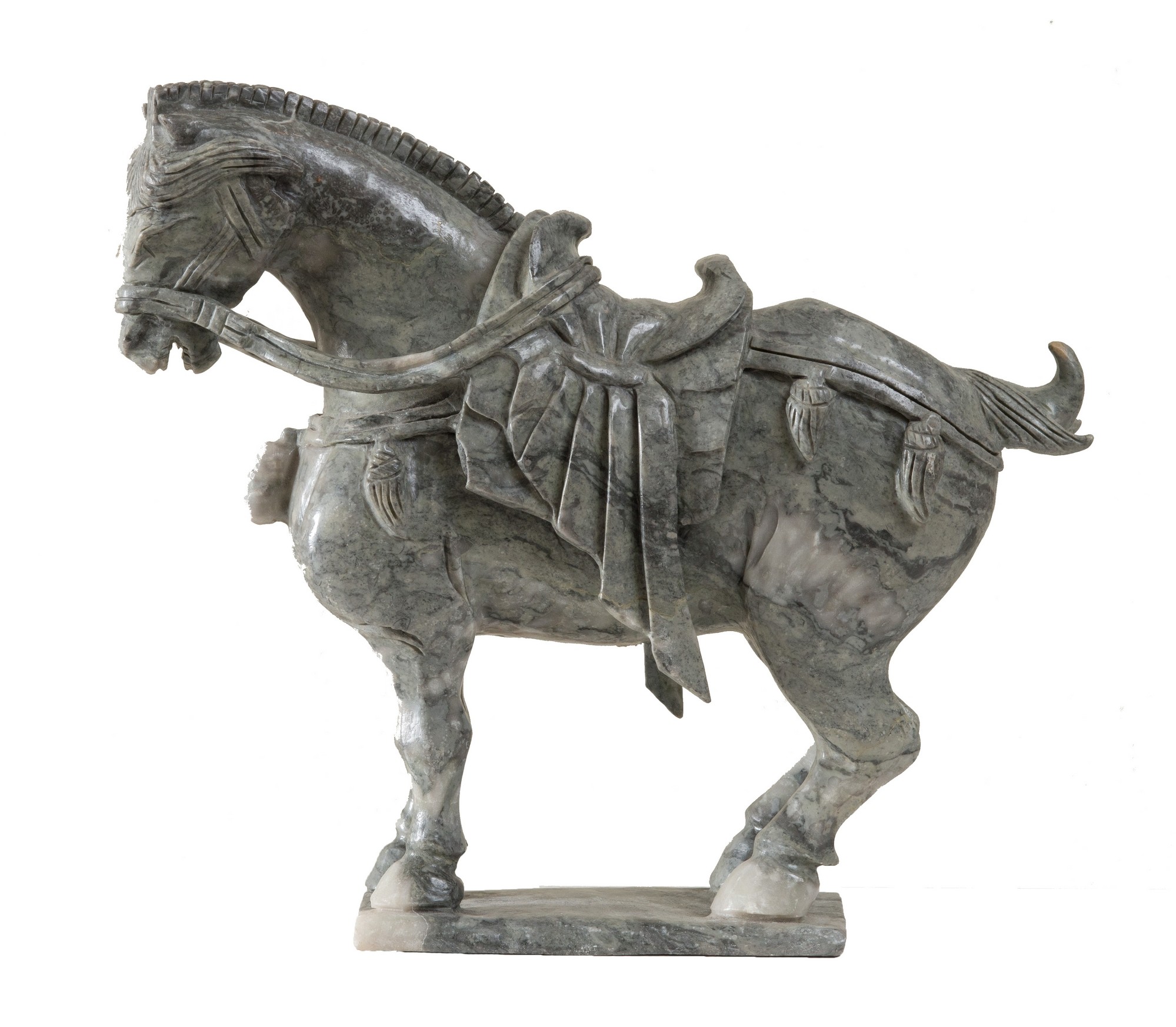 CAVALLO CINESE, XX secolo. Realizzata in pietra dura grigia. Cm 25x29x9.