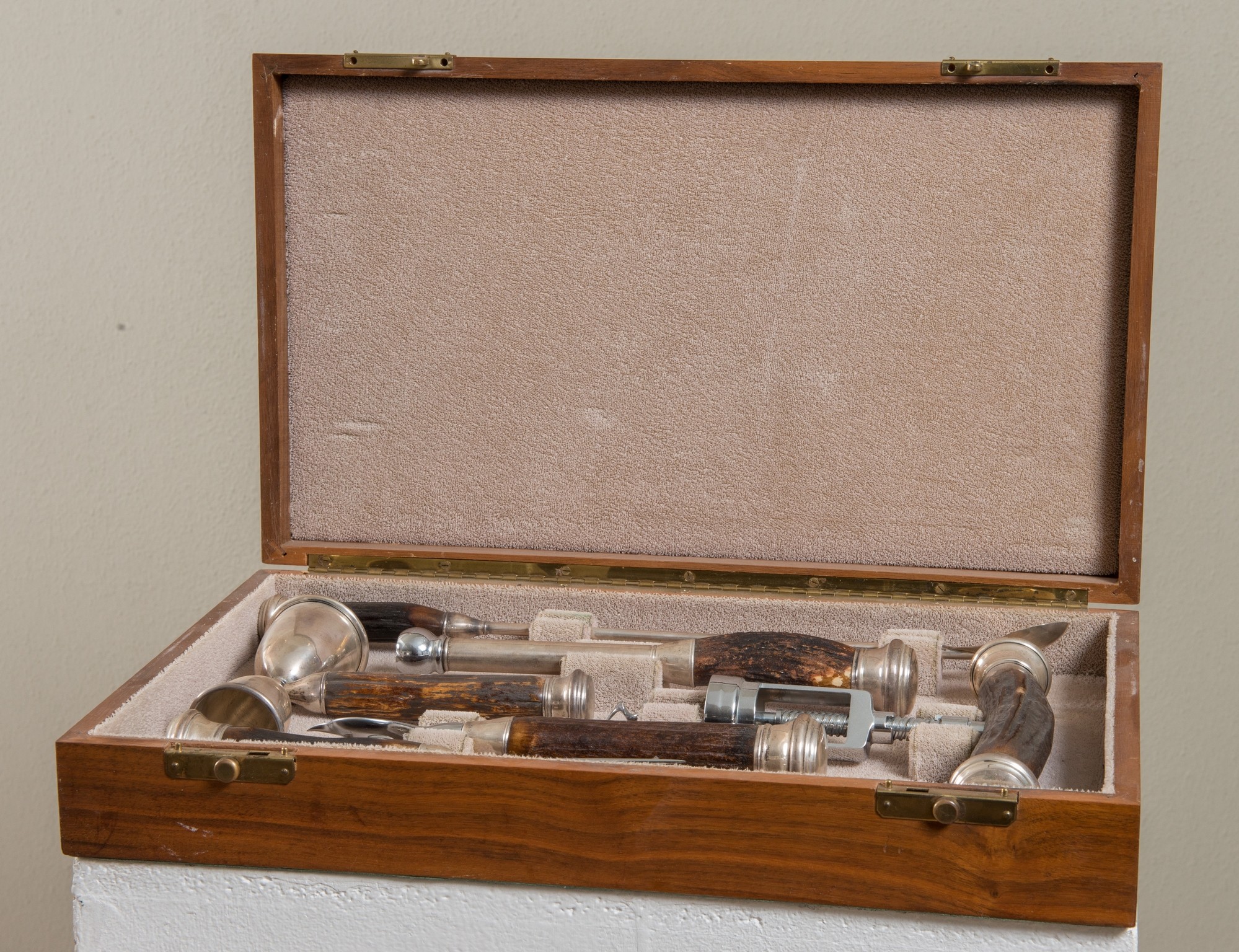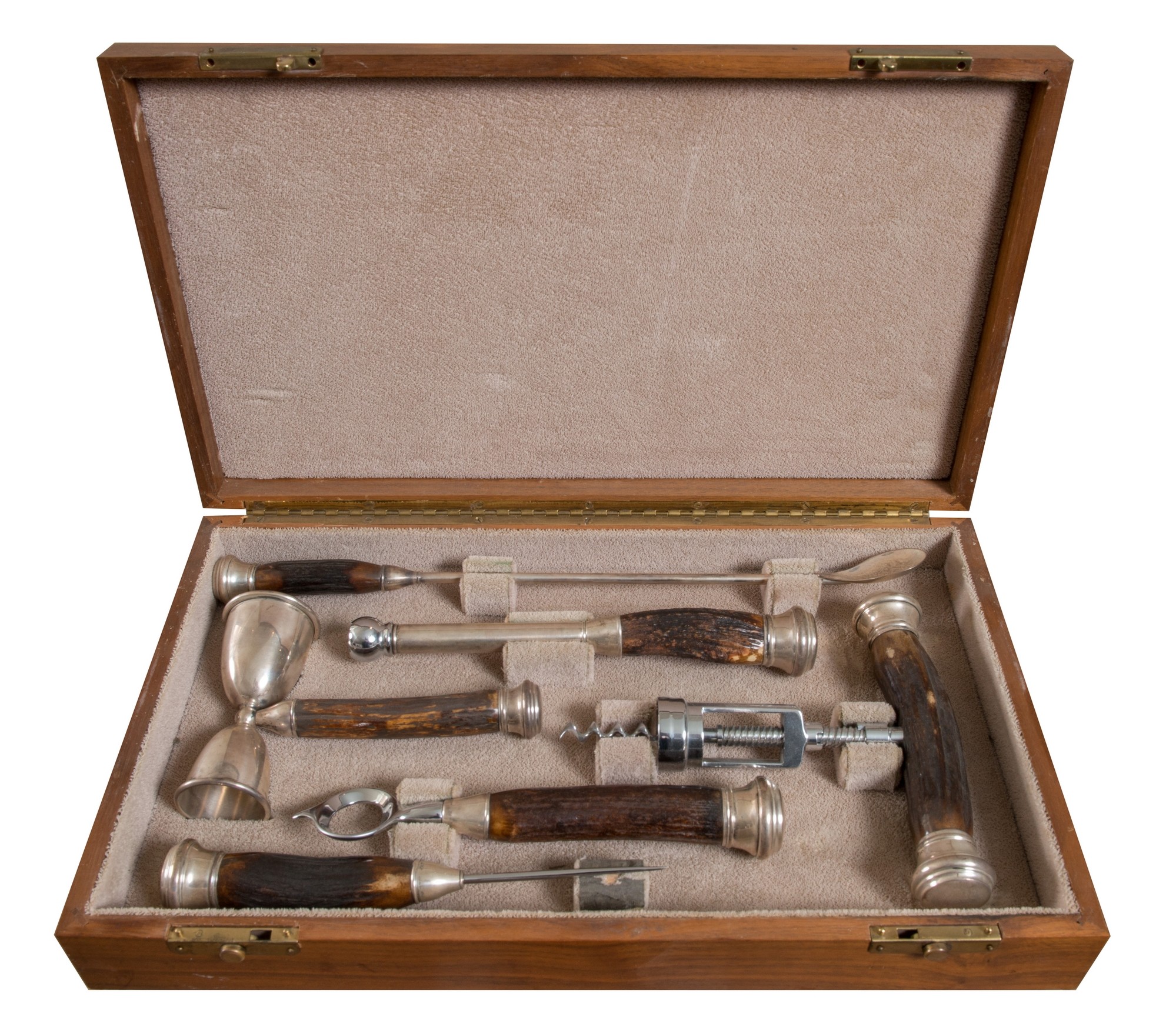 SET DA COCKTAIL IN ARGENTO, inizio XX secolo. Set composto da sei pezzi in argento e corno, nella loro scatola originale. Scatola: cm 7x40x23,5.