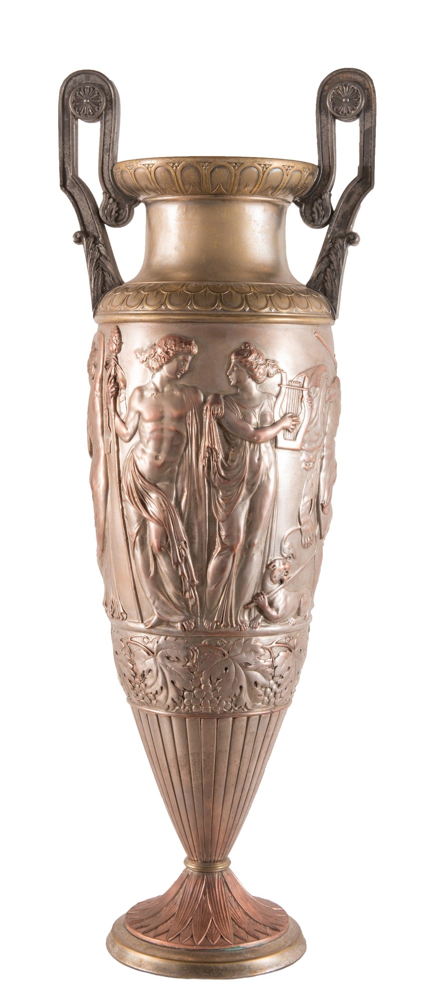 VASO, fine XIX/inizio XX secolo. Di gusto classico, è realizzato in metallo argentato e sbalzato con figure di musicanti sulla fascia. Manici da cratere. Cm 71,5x26x23.