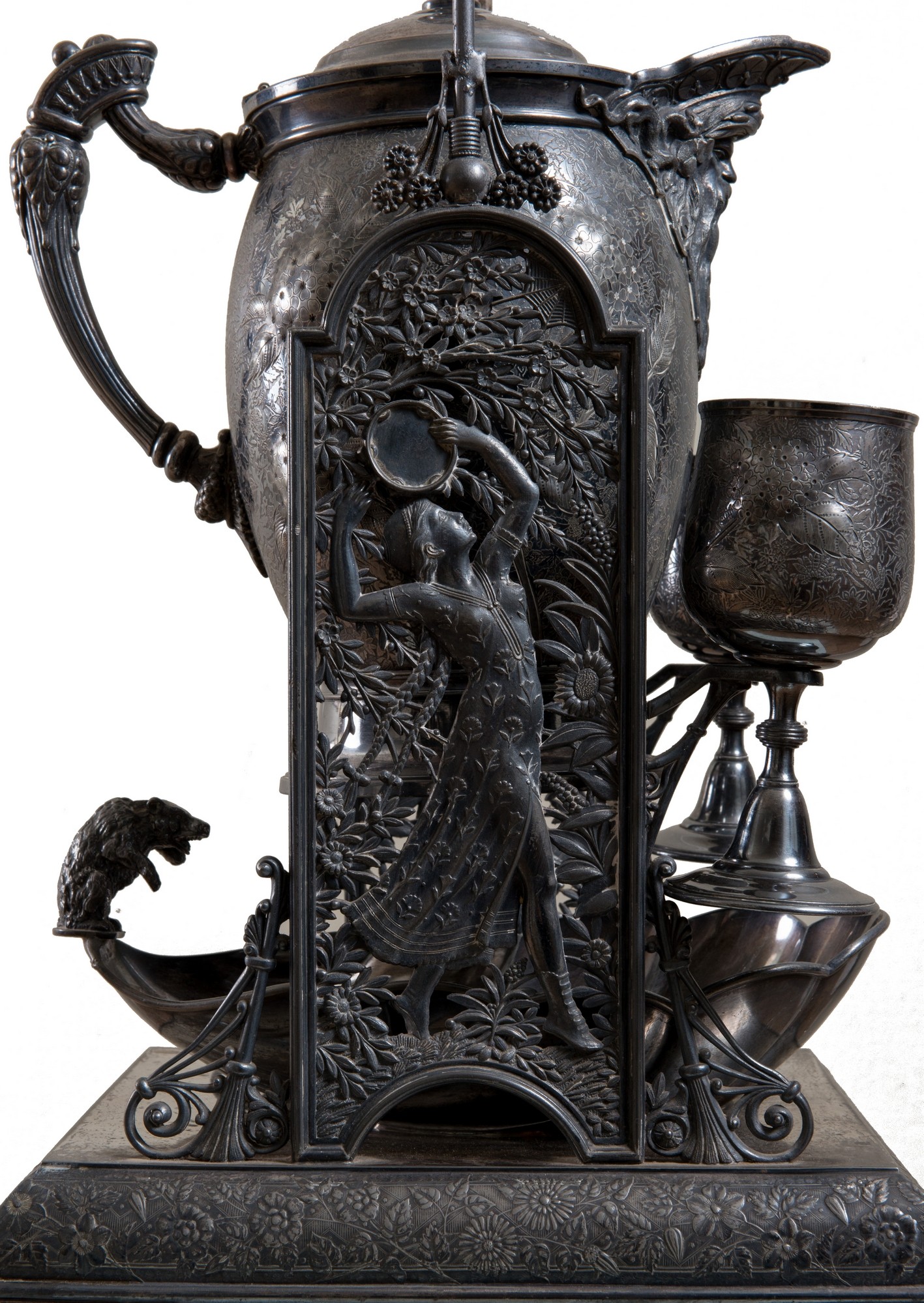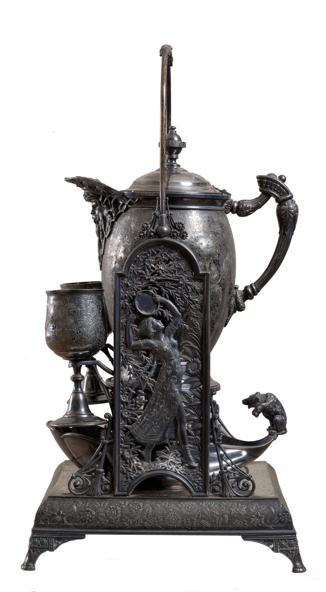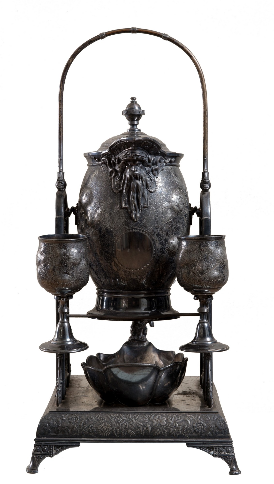 VERSATOIO DA PICNIC, seconda metà del XIX secolo. Realizzato in silverplate. Di gusto vittoriano, composto da due calici, una brocca e una vasca, il tutto sorretto da una struttura sbalzata e traforata con manico. Cm 65x30x36.