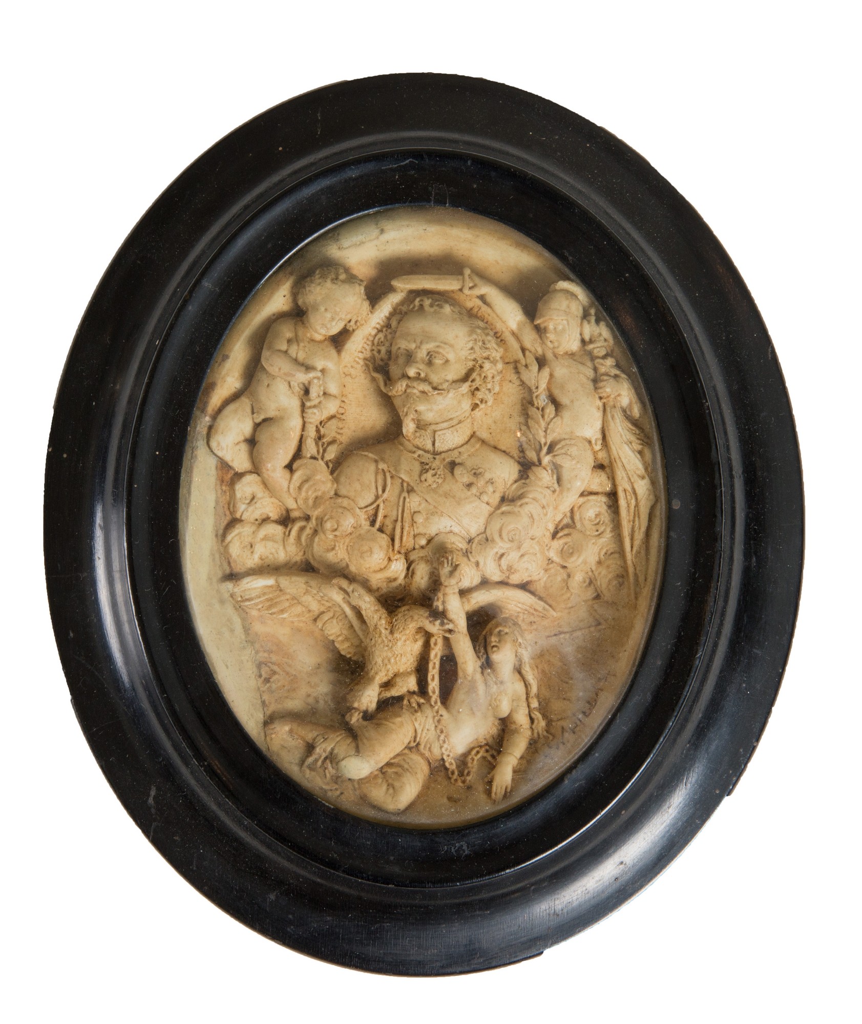 A. PILLAS, ultimo quarto del XIX secolo. “Napoleone III con aquila bicefala”, schiuma di mare in cornice ovale di legno laccata nera. Cm 16,5x13.