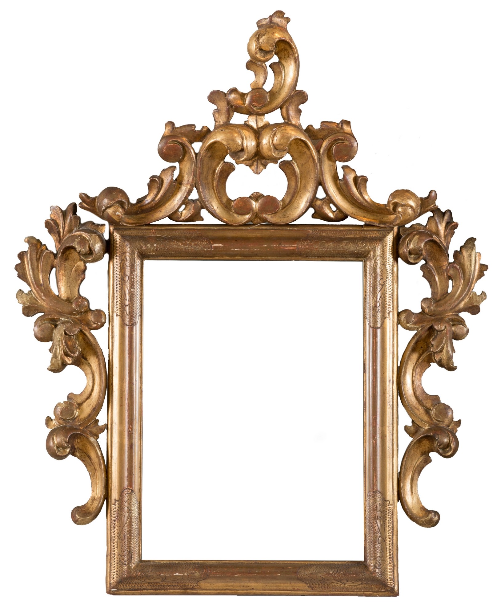 SPECCHIERA, risalente alla seconda metà del XIX secolo. Realizzata in legno intagliato e dorato. Di stile settecentesco e di gusto veneto, con cimasa estraibile. Cm 75x60x3.
