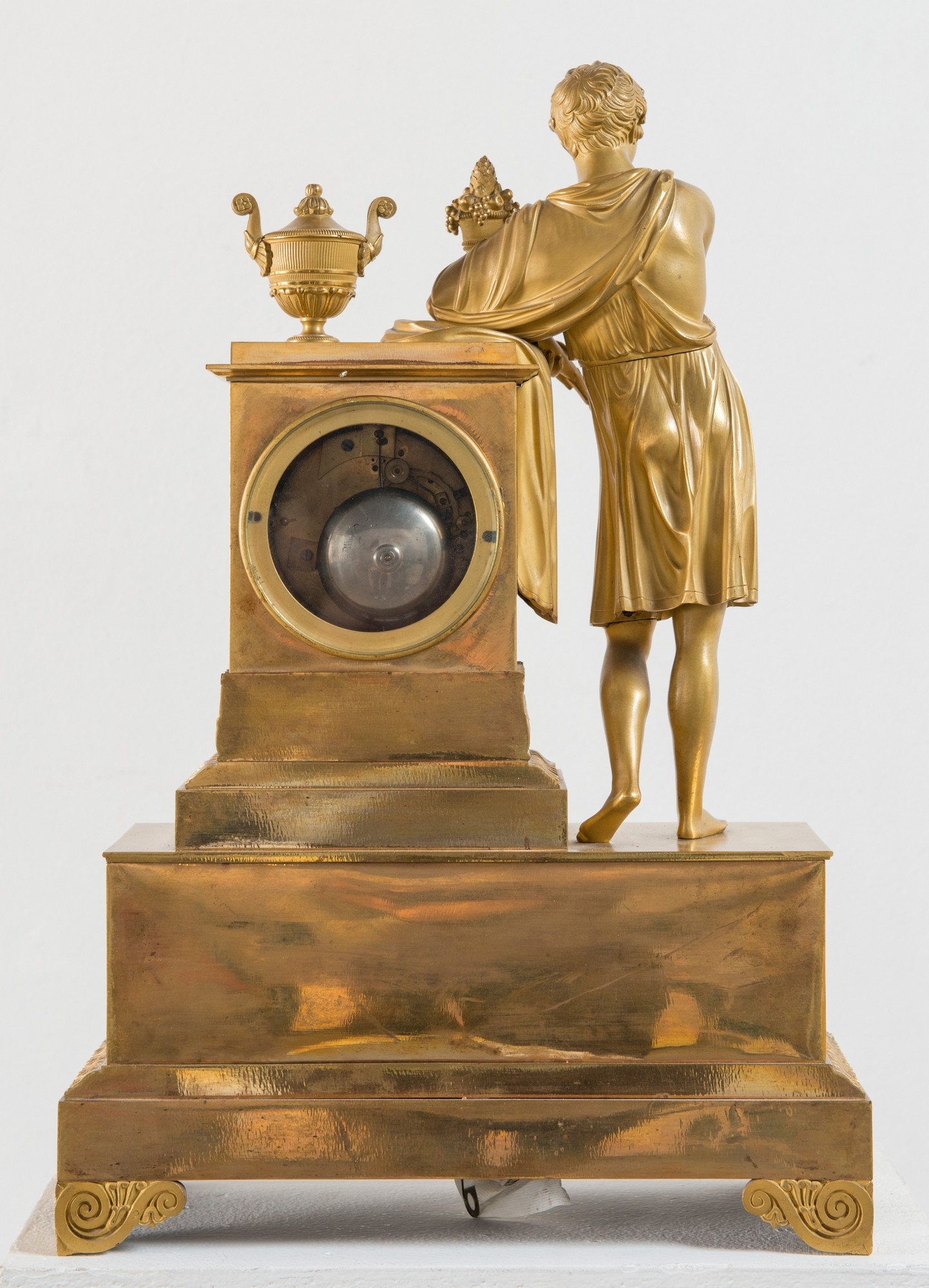 OROLOGIO IN BRONZO DORATO, Francia, prima metà del XIX secolo. Allegoria del silenzio con cornucopia. L’orologio è incastonato in una struttura a forma di erma, con decorazioni a foglie lanceolate. La base a plinto reca piedi a riccioli e decorazione a foglie lanceolate. Cm 53x36x14.