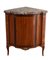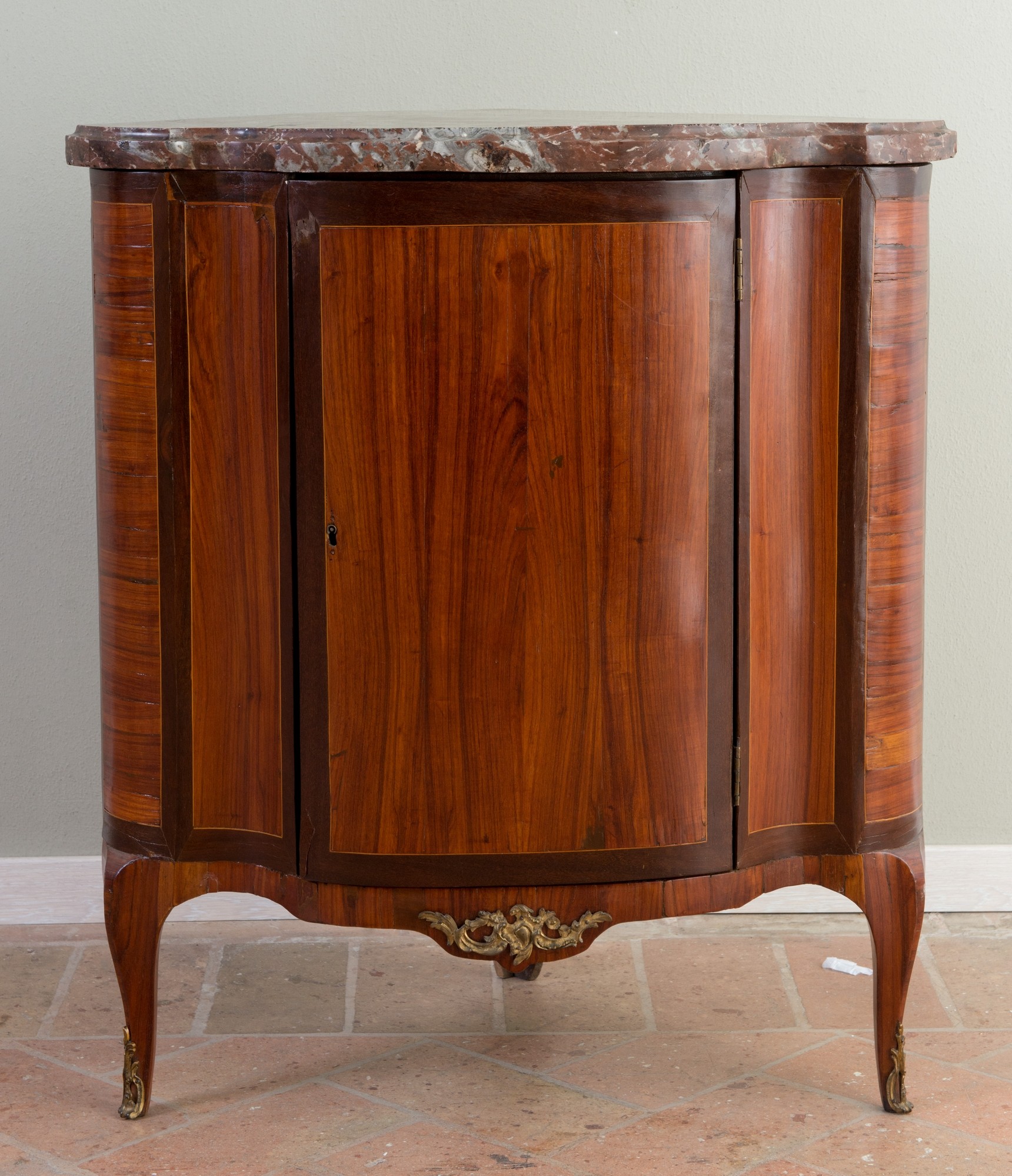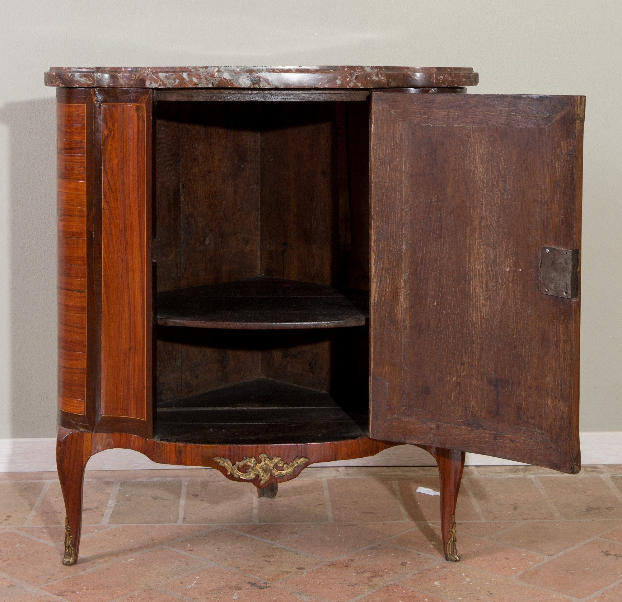 CANTONALE DELORME, metà del XVII secolo. Realizzato in massello di rovere, lastronato in bois de rose e bois de violette, con filettature in bosso. Forma mistilinea sul fronte, piano in marmo rosso Francia. Decorazione in bronzo dorato al centro della parte bassa del fronte e della parte terminale dei piedi. Reca alla sommità del montante di sinistra stampigliatura a secco dell’ebanista Delorme. Cm 89x78x53.