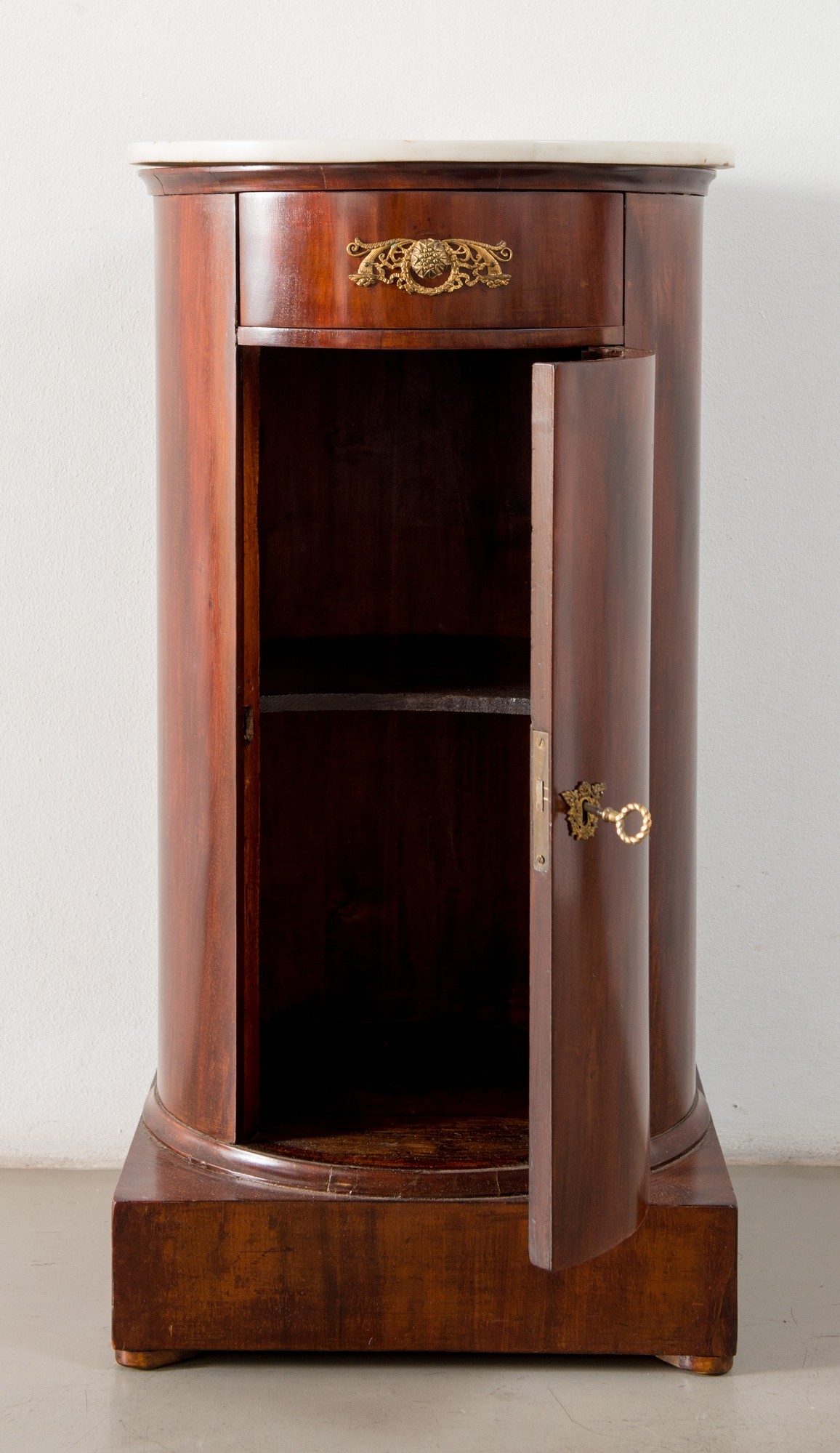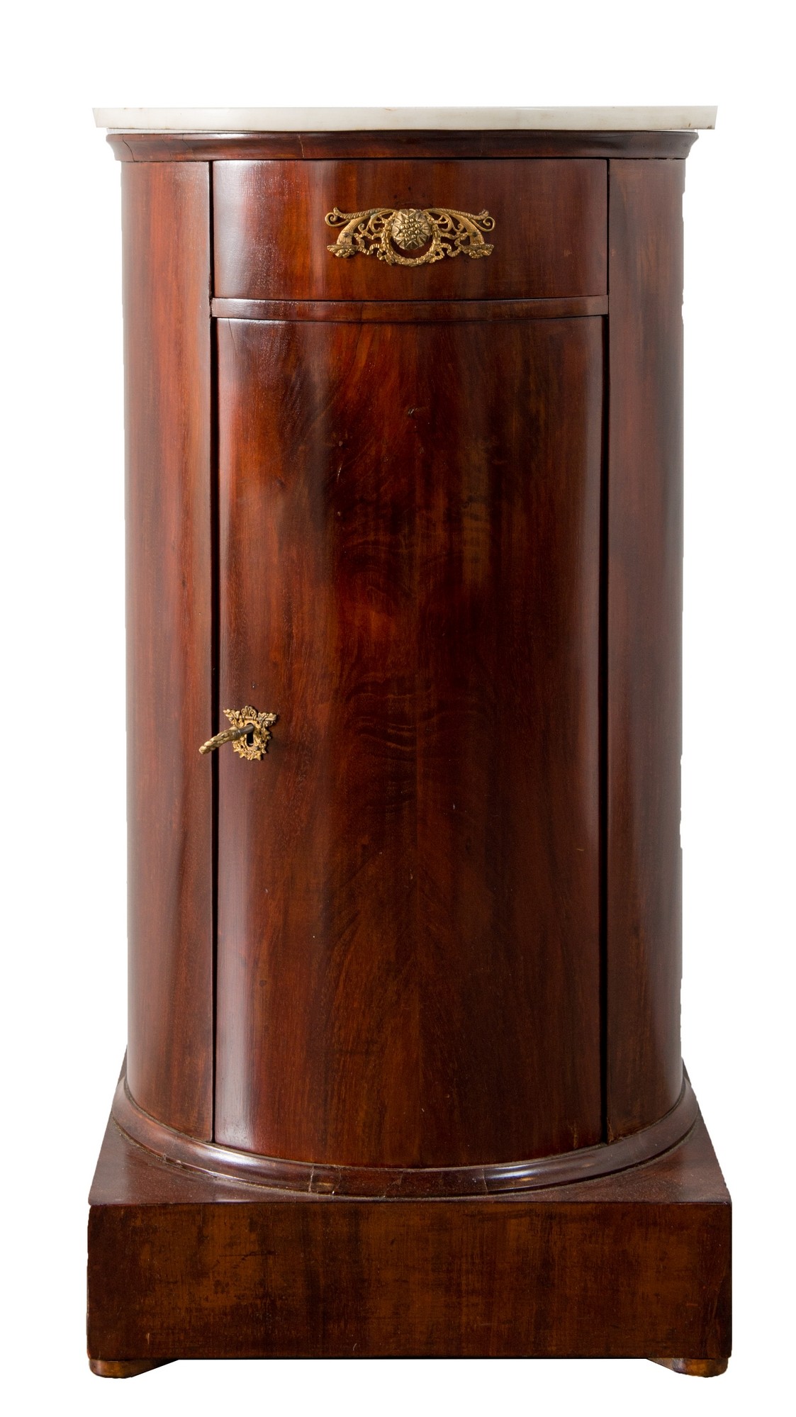 MOBILETTO A COLONNA. Ebanista Roos, inizio XIX secolo. Lastronato in mogano, con base quadrangolare. Presenta anta e cassetto sul fronte e piano in marmo bianco di Carrara. Sotto il ripiano marmoreo reca tre stampigliature a caldo Roos. Cm 86,5x46x46.