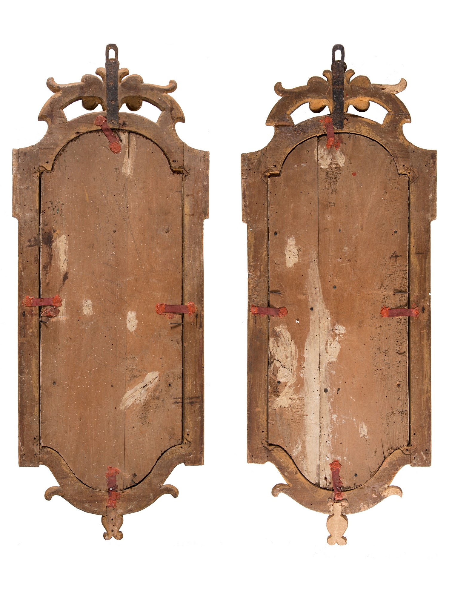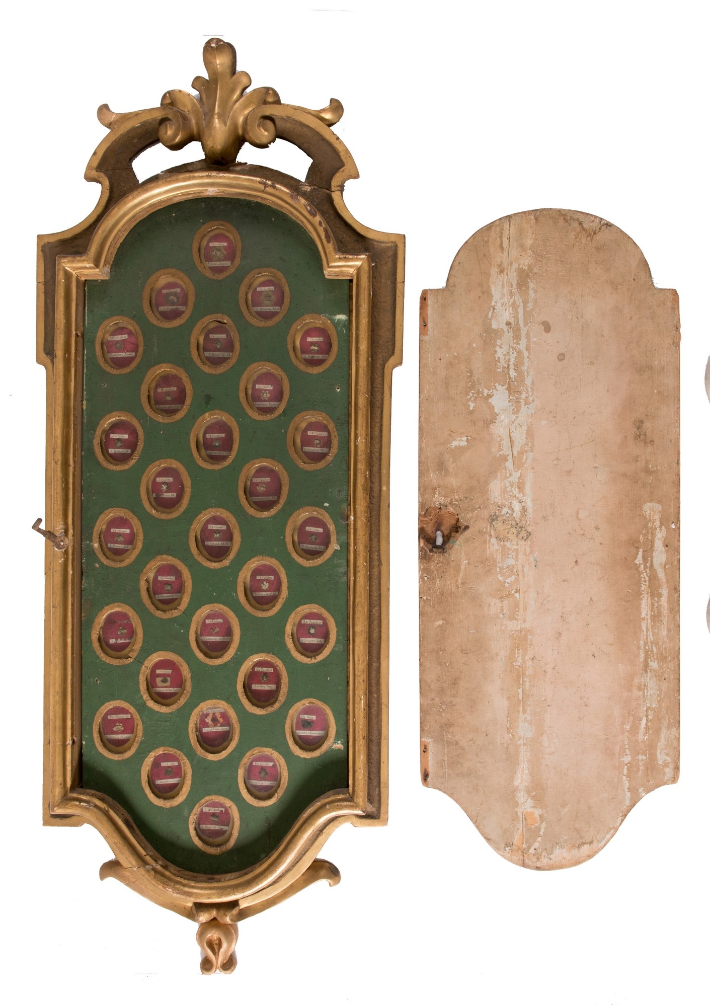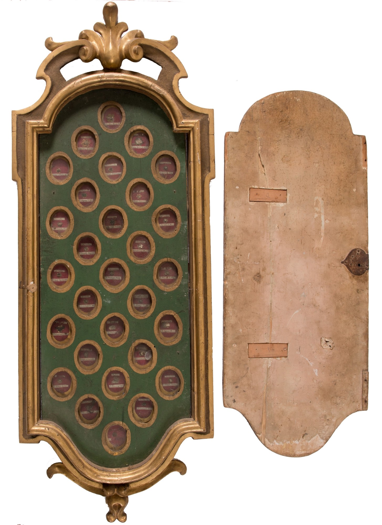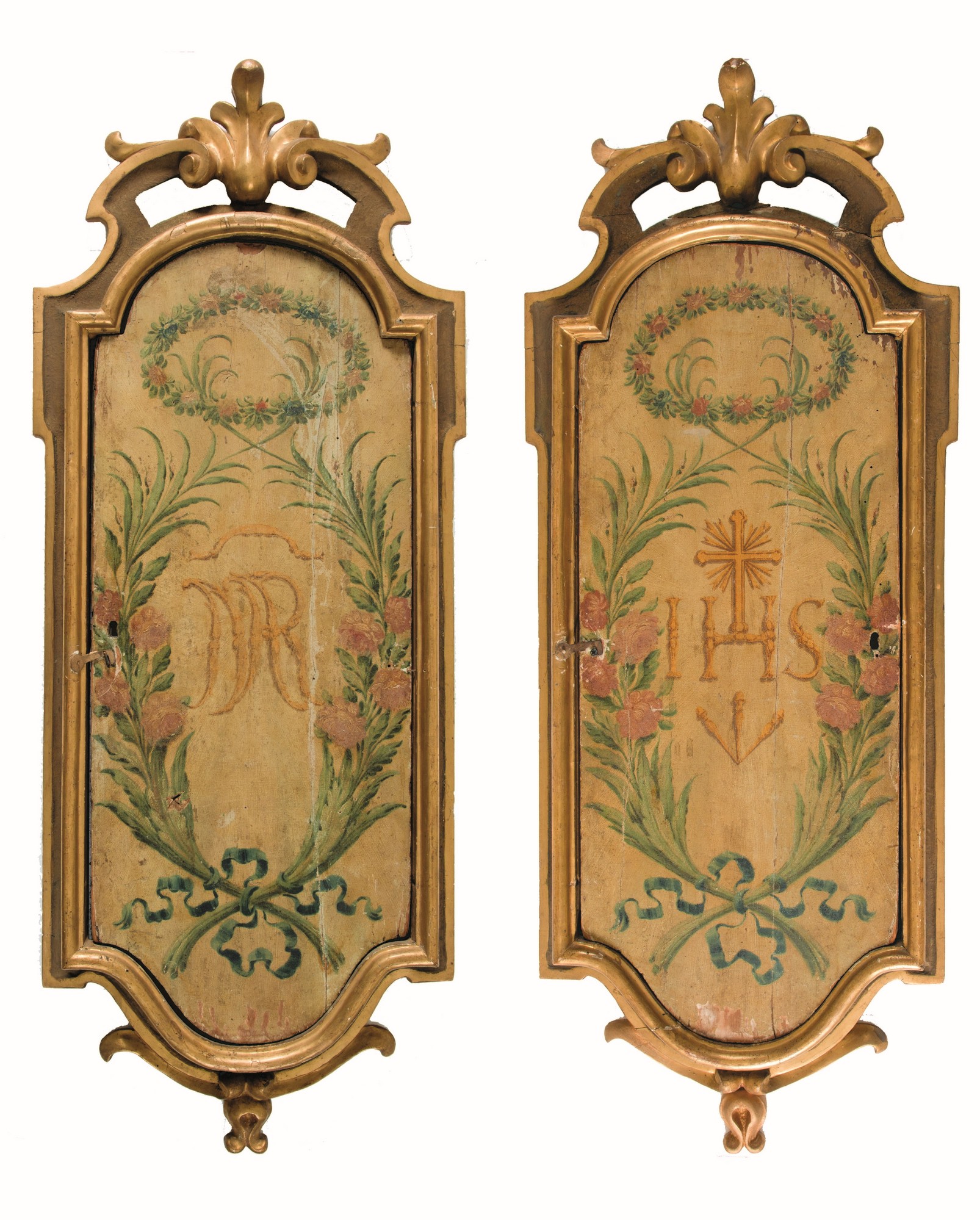 COPPIA DI RELIQUIARI EMILIANI, metà del XVIII secolo. Ciascuno avente cornice con cimasa profilata in oro e con antina laccata e decorata con motivi di palme e fiori. All’interno recano ventotto portareliquie con frammenti di reliquia e relativi nomi di santi. Al tergo recano sigilli papali originali di chiusura in ceralacca rossa. Cm 96x39x6 cadauno; Sportello: Cm 68x25x1,5 cadauno.