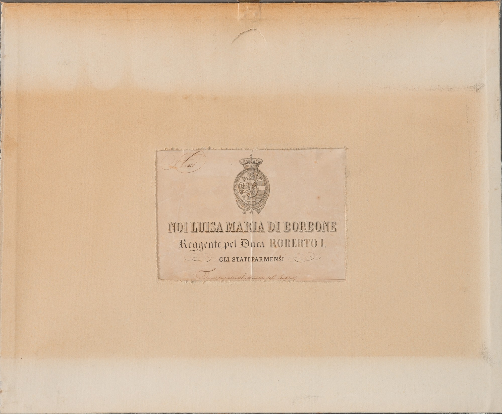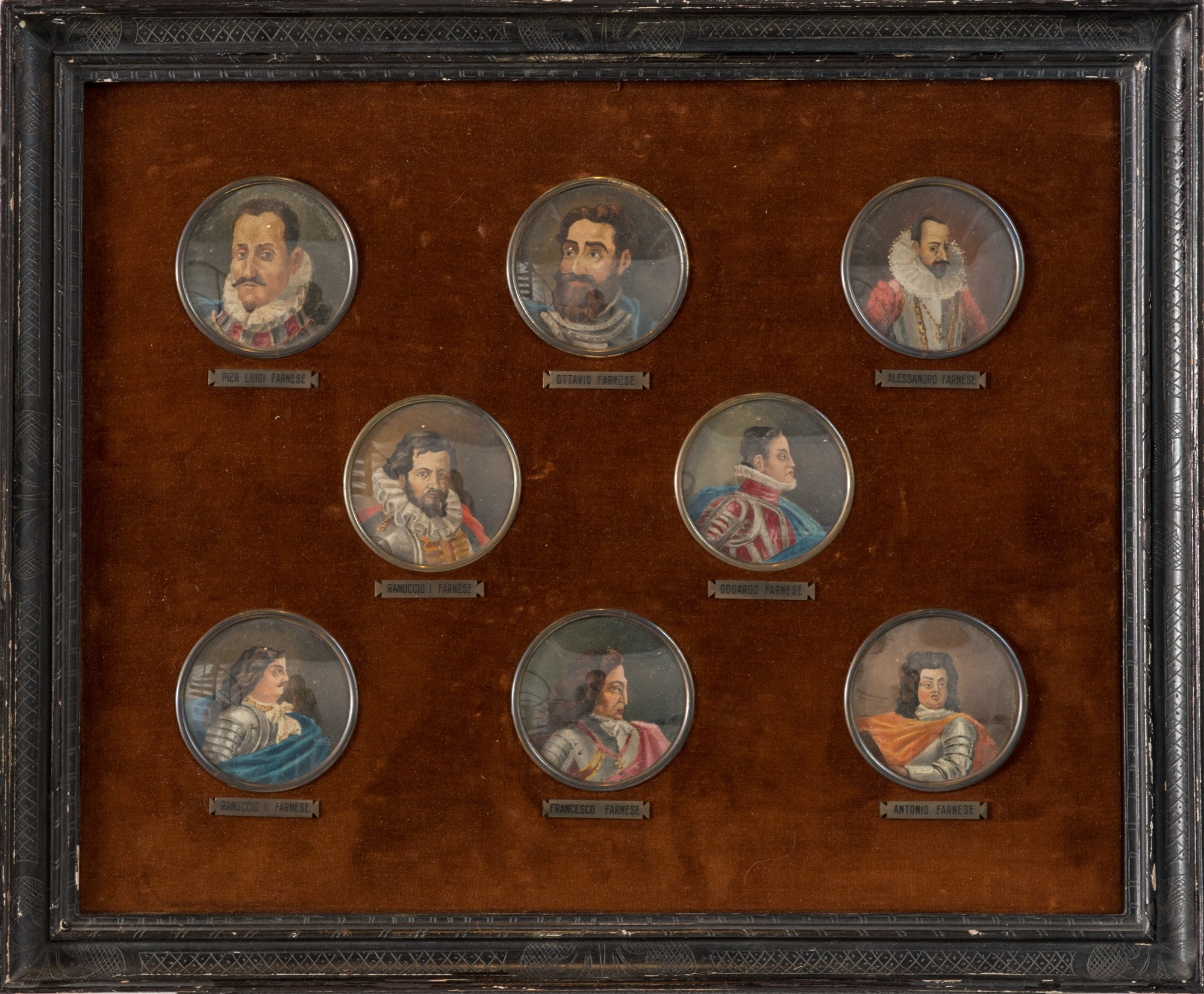 DINASTIA FARNESE. Quadretto con otto miniature della dinastia Farnese realizzate su rame. Cornice sagomata e bulinata nera. Sul retro reca cartiglio di Luisa Maria di Borbone, reggente del duca Roberto I. Cm 46x55,5.