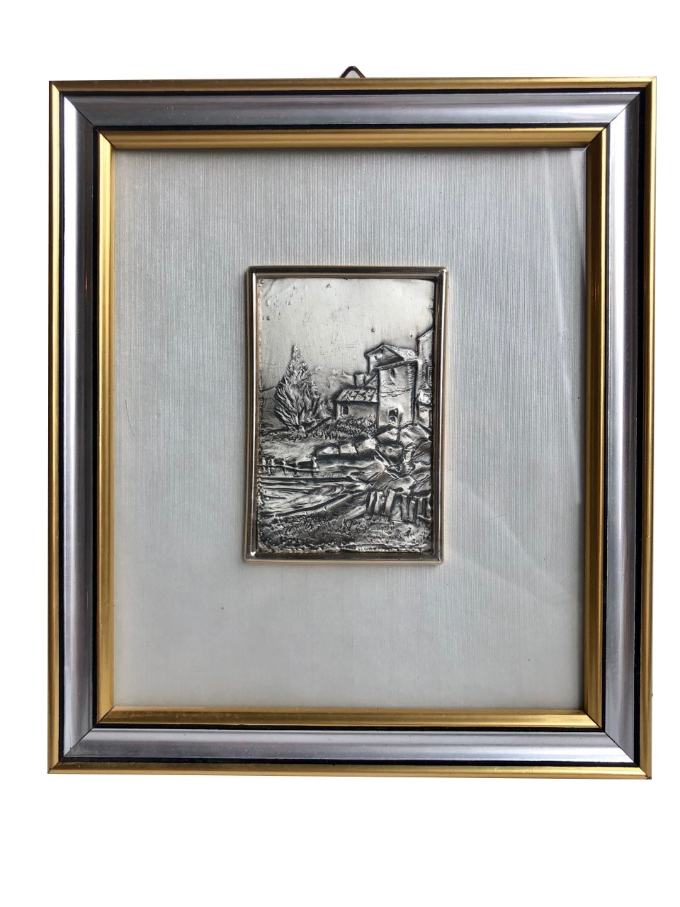 PICCOLO QUADRO DECORATIVO, XX secolo. Realizzato in lamina d’argento. Raffigura un paesaggio. Al retro reca etichetta Argenteria Cristalleria Porcellane “L’Artistica”, via San Felice Bologna. Cm. 9x6.