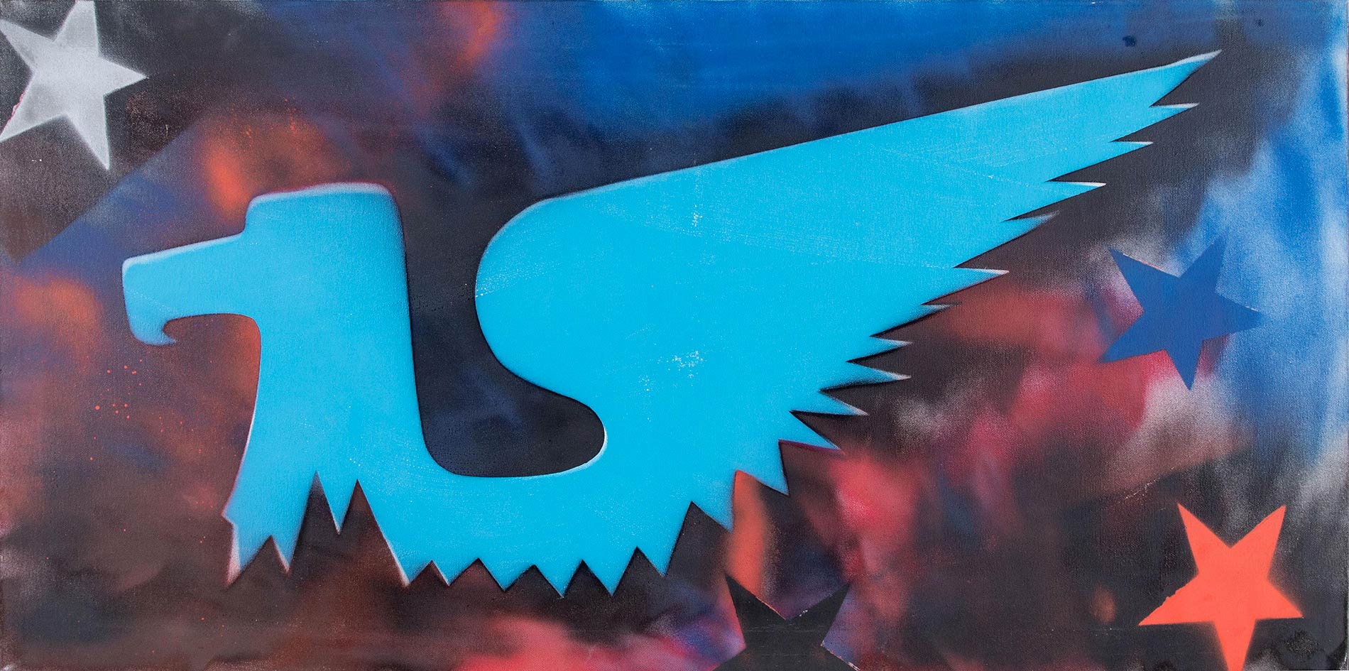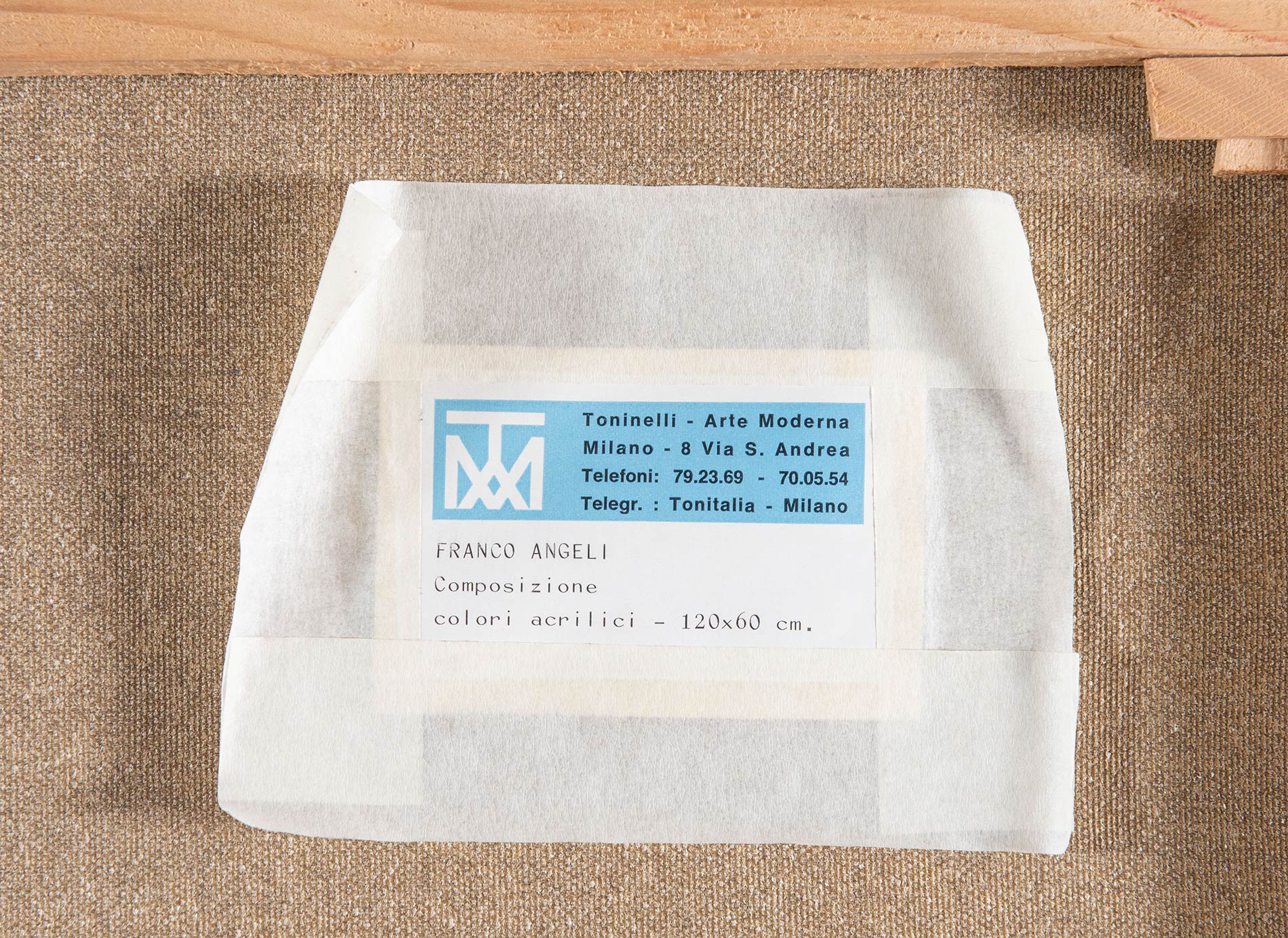 Franco Angeli (Roma 1935 - 1988), “Senza titolo”, seconda metà degli Anni ‘70. Smalto a spruzzo su tela, firmato al retro in alto a sinistra Angeli, H cm 60x120 Al retro reca etichetta Toninelli Arte Moderna – Milano. Opera accompagnata da certificato di autenticità dell’Archivio Franco Angeli, 7 Dicembre 2017 – numero di archiviazione: P-241017/1246.