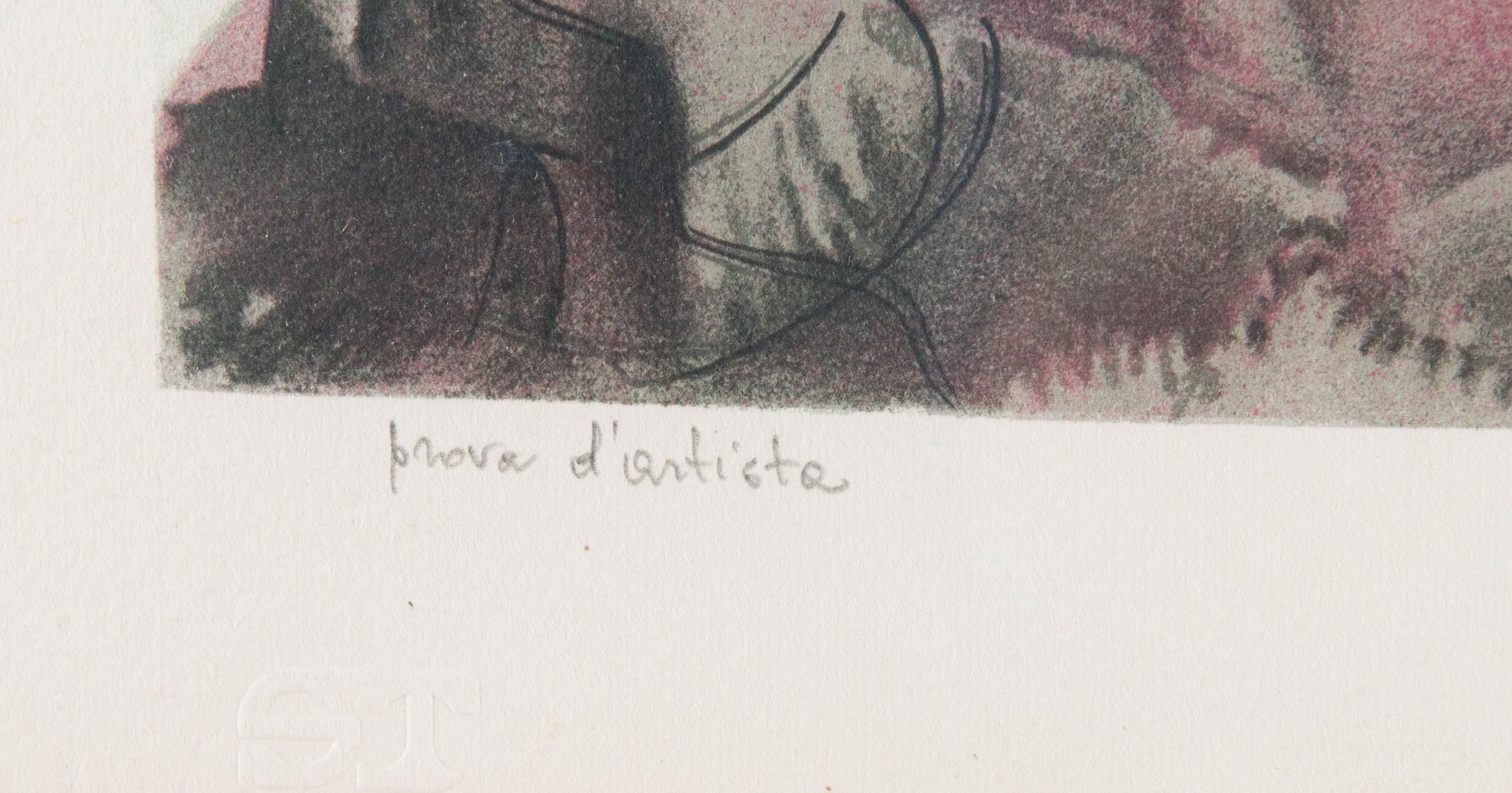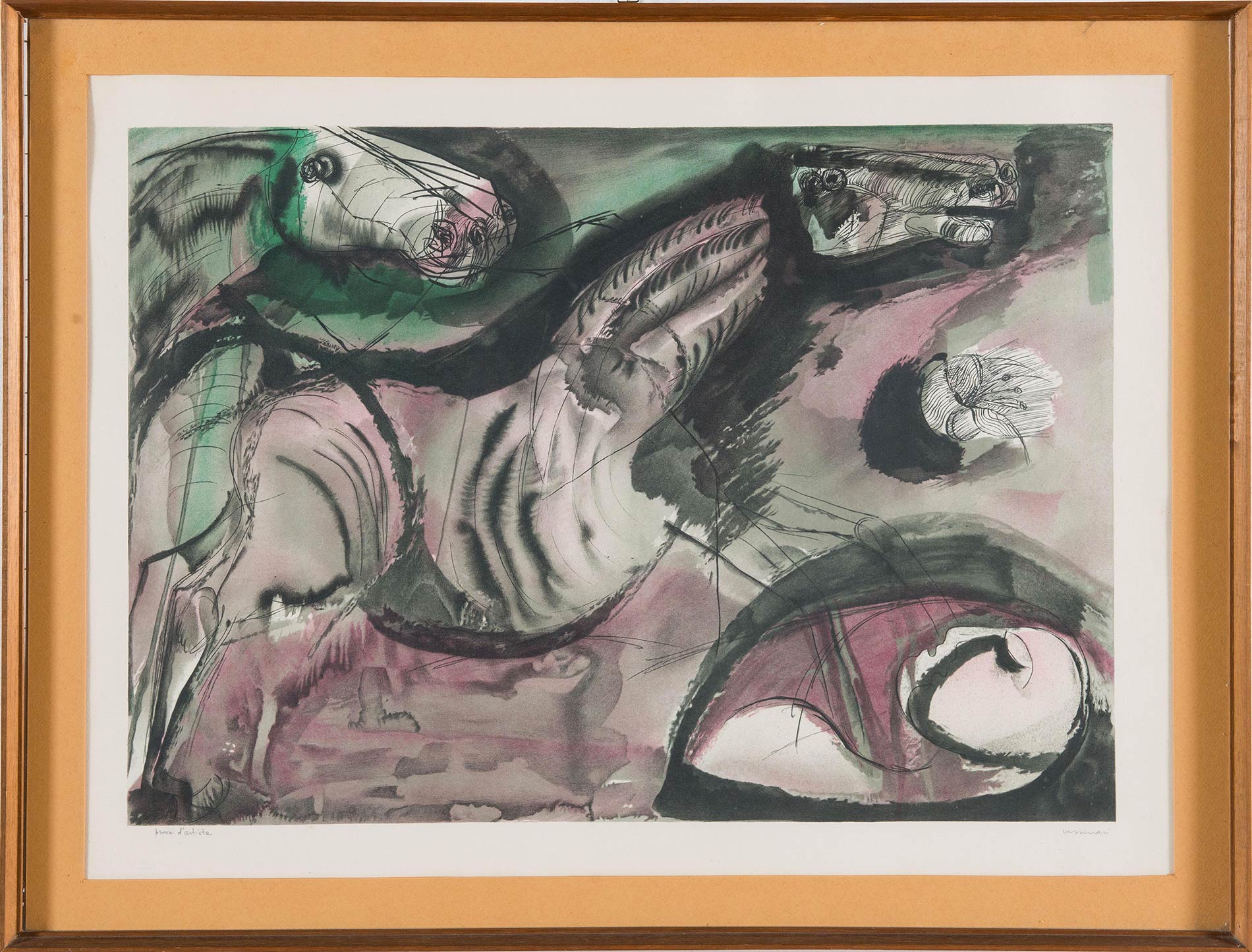 Bruno Cassinari (Piacenza 1912 - Milano 1992), “Cavalli”. Litografia a colori su carta, firmata in basso a destra Cassinari, esemplare prova d’artista, in basso a sinistra timbro a secco ST, Lastra H cm 49x69