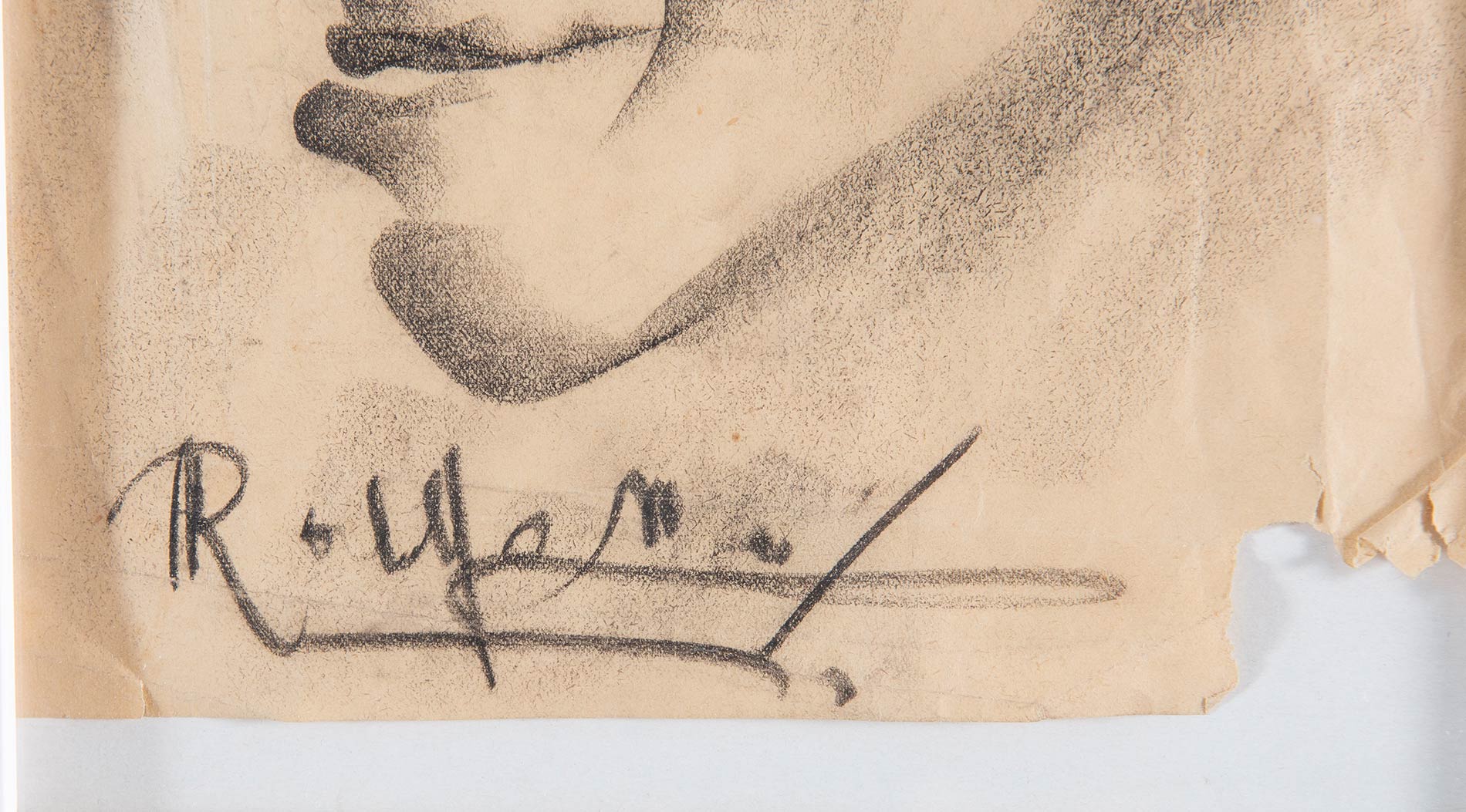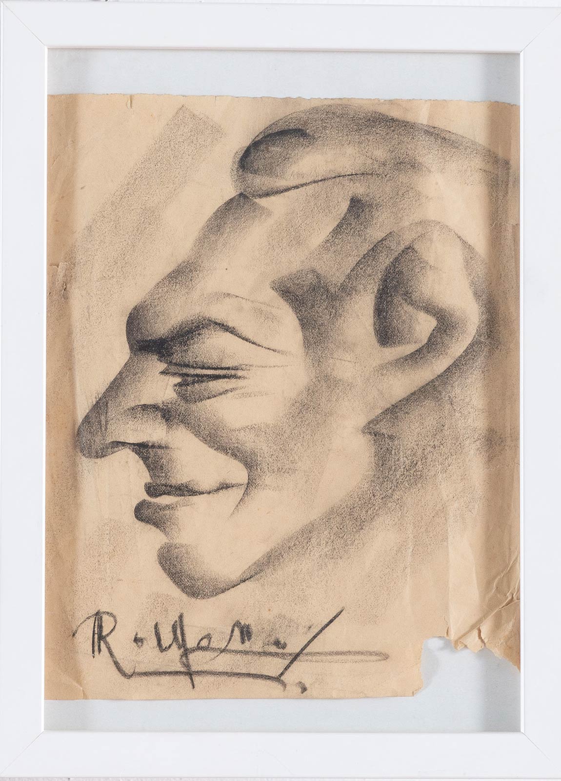 Pittore del XX sec., “Caricatura di profilo”. Carboncino su carta, reca firma in basso a sinistra non decifrata, H cm 25.5x21.5