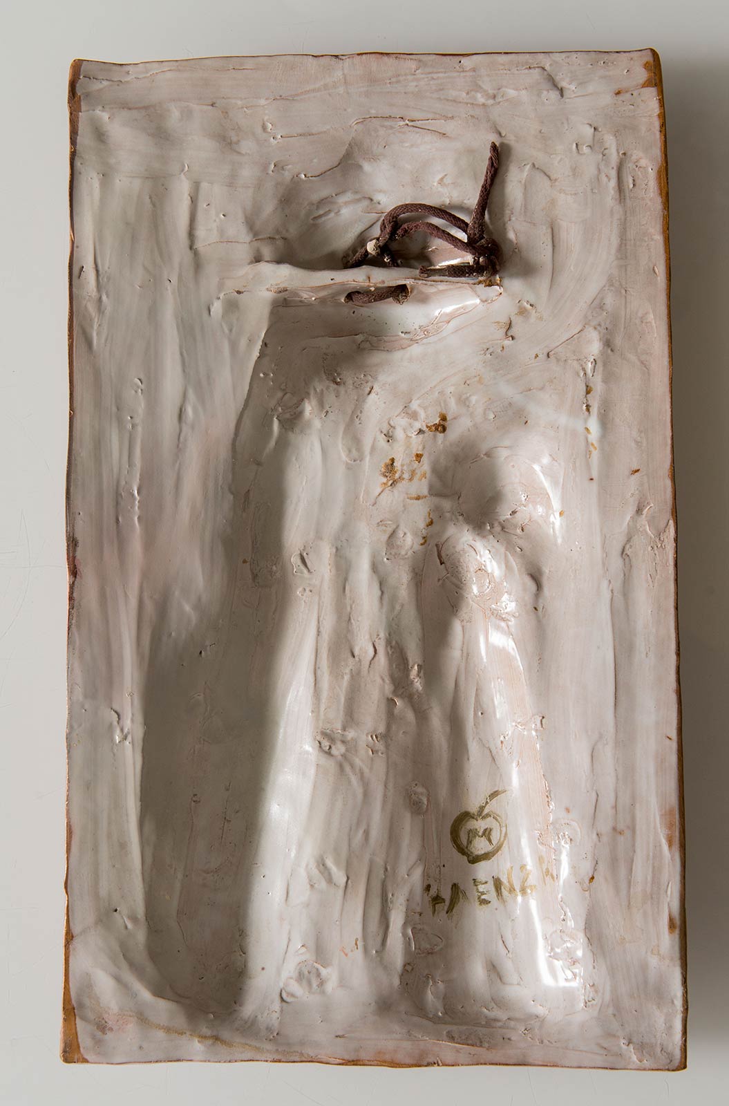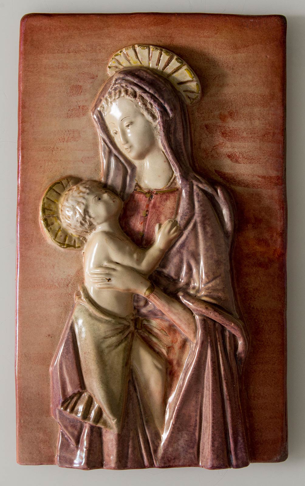 Manifattura del XX sec., “Madonna con Bambino”. Formella in ceramica policroma, al retro e sul bordo reca M entro simbolo grafico - Faenza, H cm 44x27.5